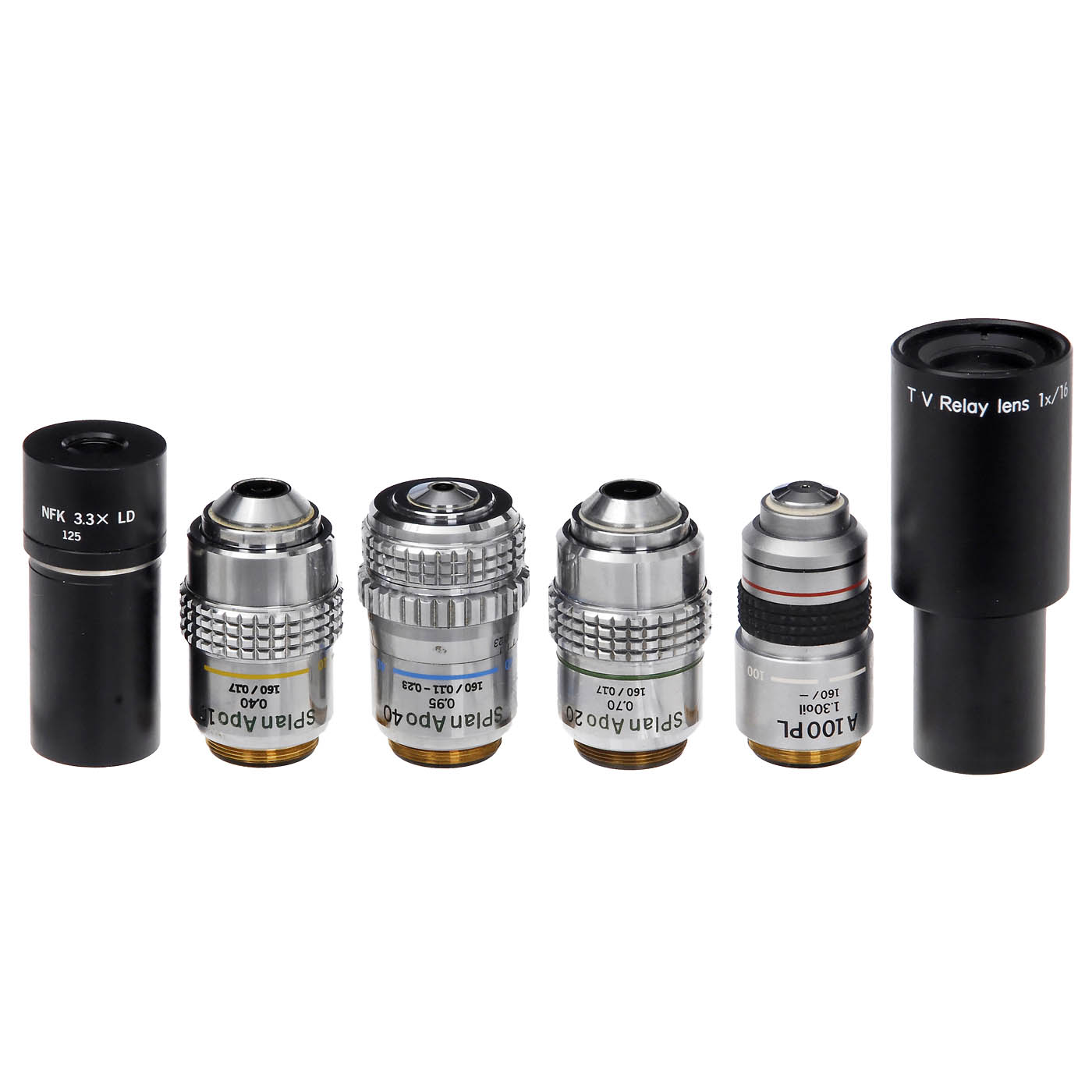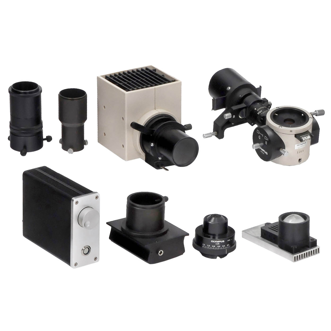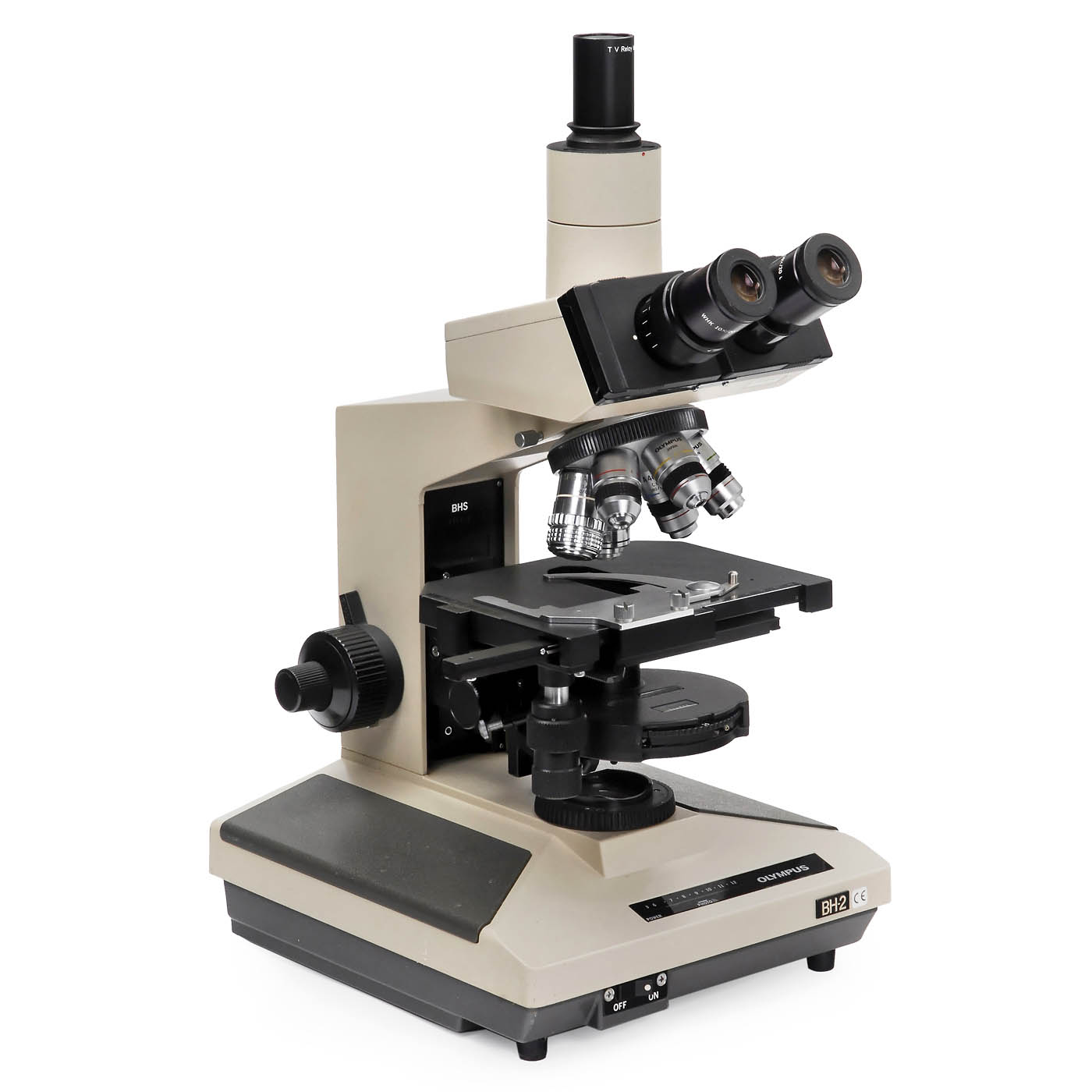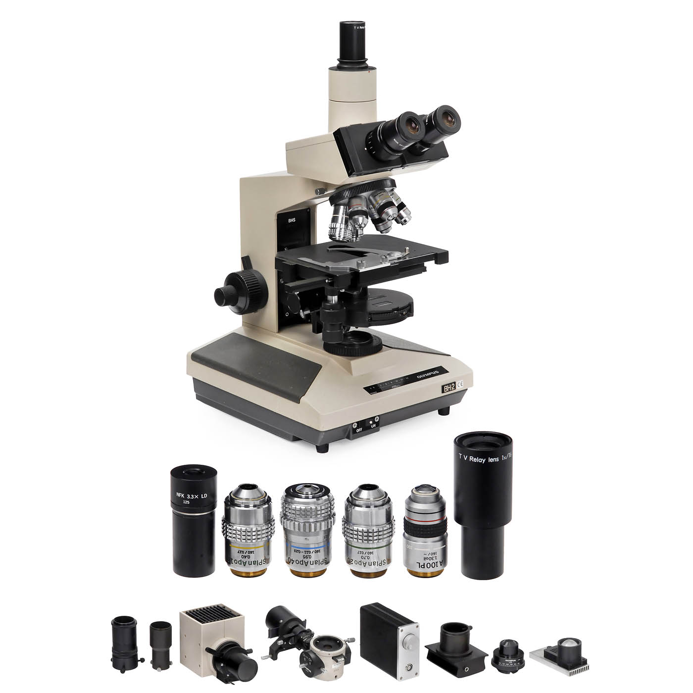 Olympus, Japan. Modular research and laboratory microscope, BHS stand with 30˚ inclined binocular tube, 2 side hand rests, smoothing-operating knobs for coarse and fine adjustment, 100-watt halogen illumination, BH2-PC phase contrast attachment, BH2-SVL cross-stage with ball-bearing guide system, 6-position turret, height 19 ¾ in., with the following accessories: 5 eyepieces (2 x T V Relay Lens 1x/16, 2 x WHK 10x/20 L and 1 x NFK 3,3x LD), 10 objectives (A 10 PL, A 20 PL, A 40 PL, SPlan Apo 10, SPlan Apo 20, SPlan Apo 40, SPlan Apo 60, SPlan Apo 100, DPlan 4 and A 100 PL), lighting units with transformers, 2 adapter sleeves and other items.