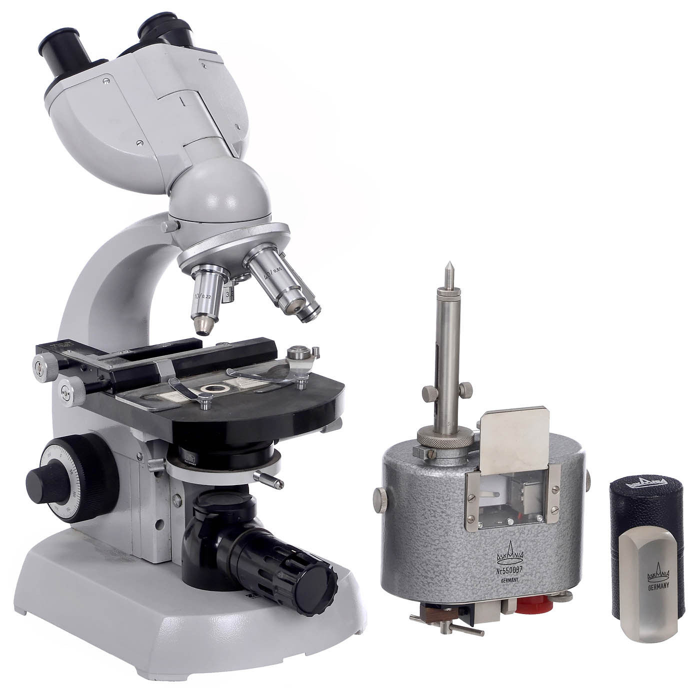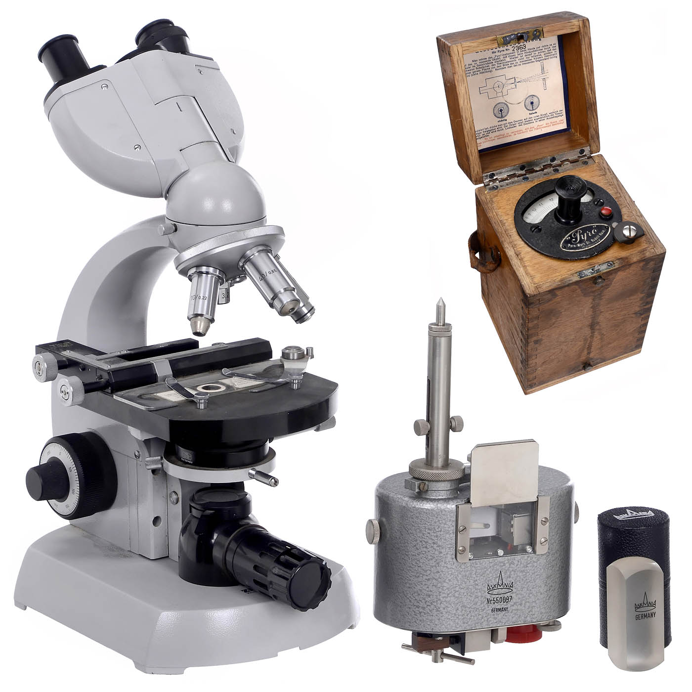 1) Carl Zeiss, West Germany. Binocular, four objectives, adjustable interocular distance, electric illumination, swiveling condenser lens, large cross table, fine and coarse adjustment on both sides, height 14 ½ in. – 2) Pyrometer, Pyro No. 2363, Dr. Rudolf Hase, Hanover, in wood case. – And: 3) Tast-Schwingungsschreiber, Askania-Werke, Berlin, with instructions in leather case.
