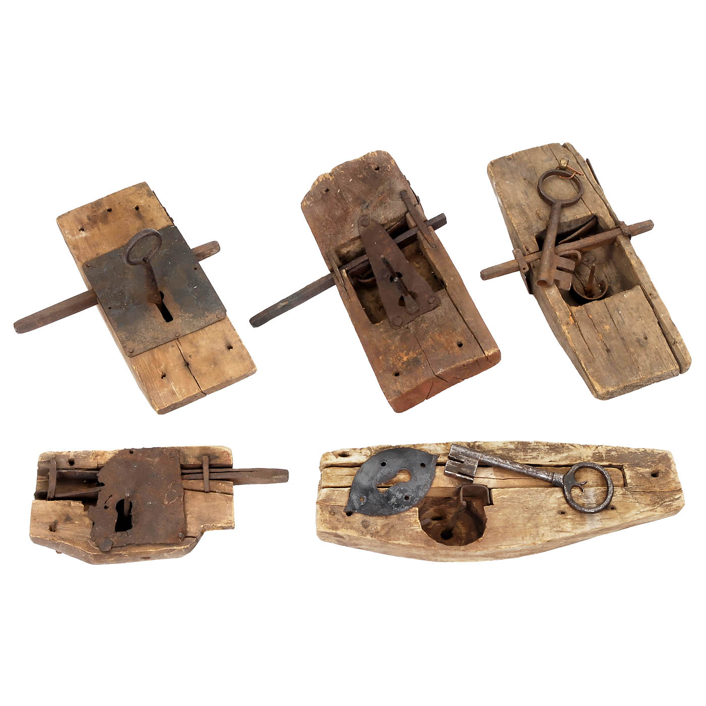 1) 5 locks made of wood and wrought iron, 16th –17th century, 3 with keys. – 2) 18 wrought-iron locks, 17th–18th century, 5 with keys. – And: 3) 7 keys.