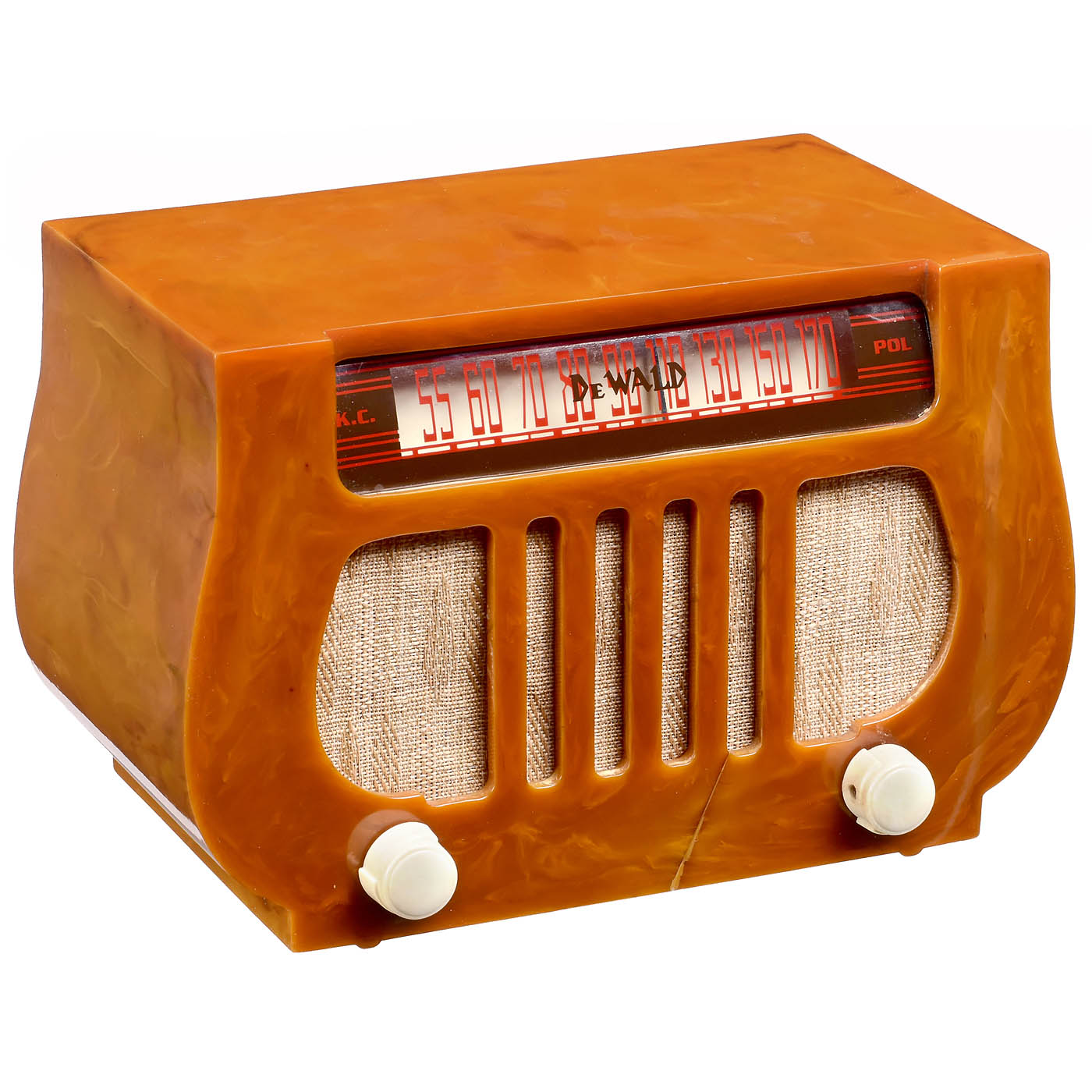 1) DeWald, model A-501 Harp, DeWald Radio Mfg. Corp., USA, five tubes, medium wave only, 105–125 volts, built-in dynamic speaker, base cracked, otherwise complete and in good condition. – And: 2) Fada Bullet Radio, model 1000, Fada Radio & Electric Co., Long Island (NY), USA, six tubes, medium wave only, 115 volts, built-in dynamic speaker, one knob missing, plastic cover over dial damaged, based cracked, complete with tubes and back panel.