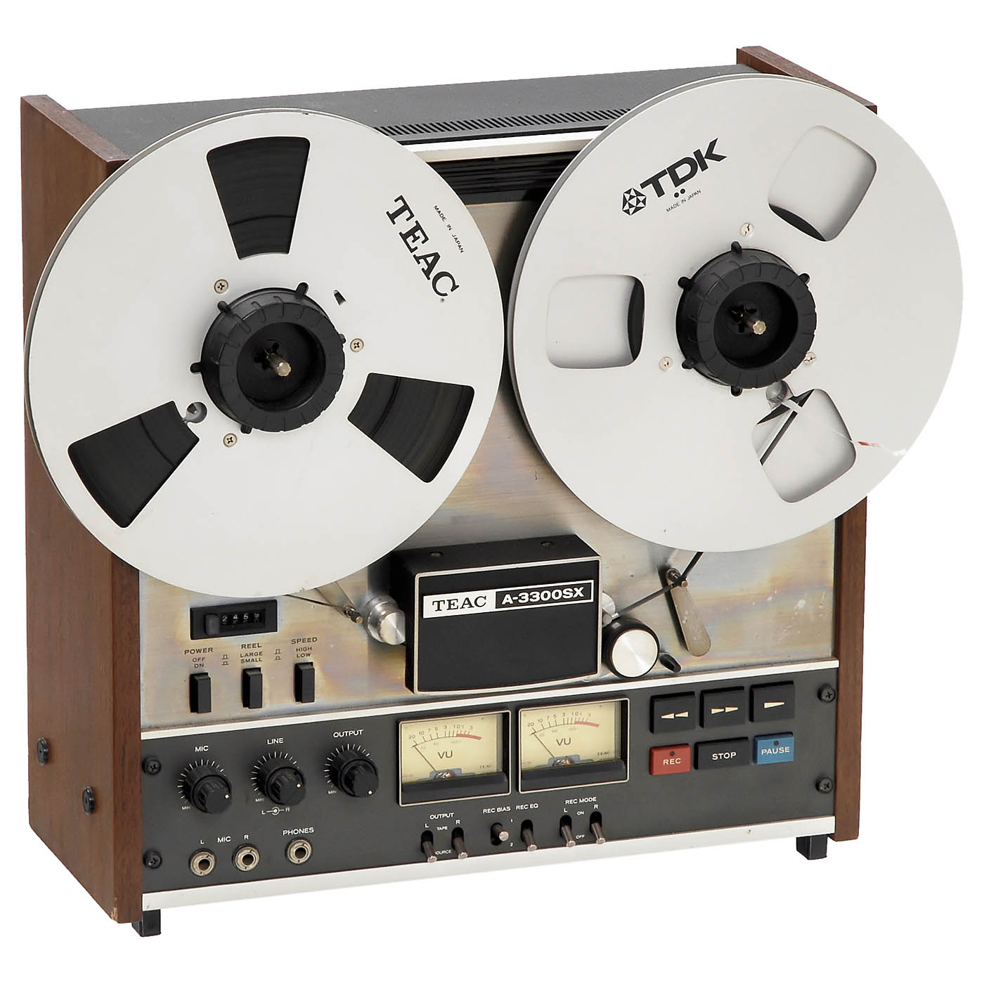 1) Teac A-3300SX, stereo reel-to-reel tape recorder, Japan, c. 1977, for 26.5 cm reels, 3 motors, 3 heads, with 2 metal reels, works. – 2) Braun TG 1000, 1971 onwards, 2-track reel-to-reel tape, 110–240 volts AC, 3 tape speeds: 4.75, 9.5 and 19 cm/s, design by Dieter Rams, motors work, tested without tape. – 3) Sony TC-378, quarter-track tape-to-tape recorder, Japan, 1976, 3 tape speeds, untested. – 4) Braun C301M, cassette deck, c. 1980, 2-motor drive, works, otherwise untested. – And: 5) 3 metal reels, 26.5 cm, and 5 Agfa 1000m tapes in boxes.