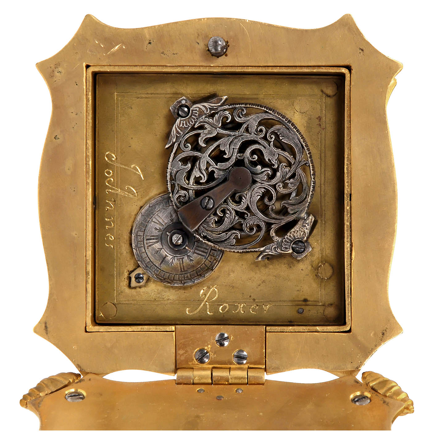 1) Jaeger board clock, c. 1935, vintage car clock, brass case, Ø 3 1/6 in., working (without guarantee). – 2) Birdcage with moving bird as table clock, c. 1930, brass and bronze, height 5 in., the bird moves every second, working (without guarantee). – And: 3) Horizontal table clock, copy after an 18th century original, rectangular, profiled, stepped and gilded brass case, ornamentally engraved with flower motifs, 4 screwed-on disc windows, single-day movement with fusee-and-chain, backplate engraved "Johannes Roxer", spring-movement defective, otherwise good condition.