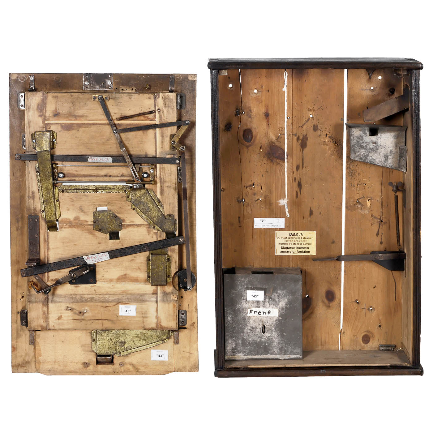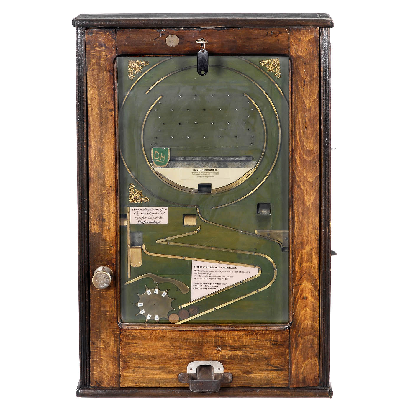 Probably Wilhelm Fürst, Apparate-Bauanstalt, Berlin. Mechanical skill game with payout, similar to the model "Henkeltöpfchen", a slingshot and catcher combination, in oak case, with lock and key, converted for the Swedish market, 2-öre slot, working.