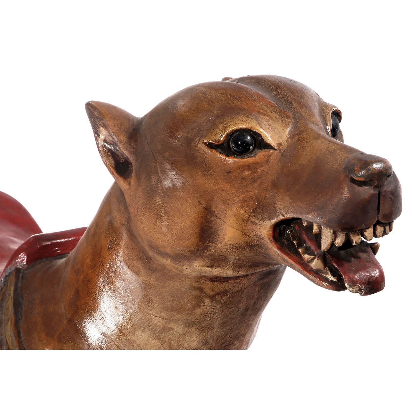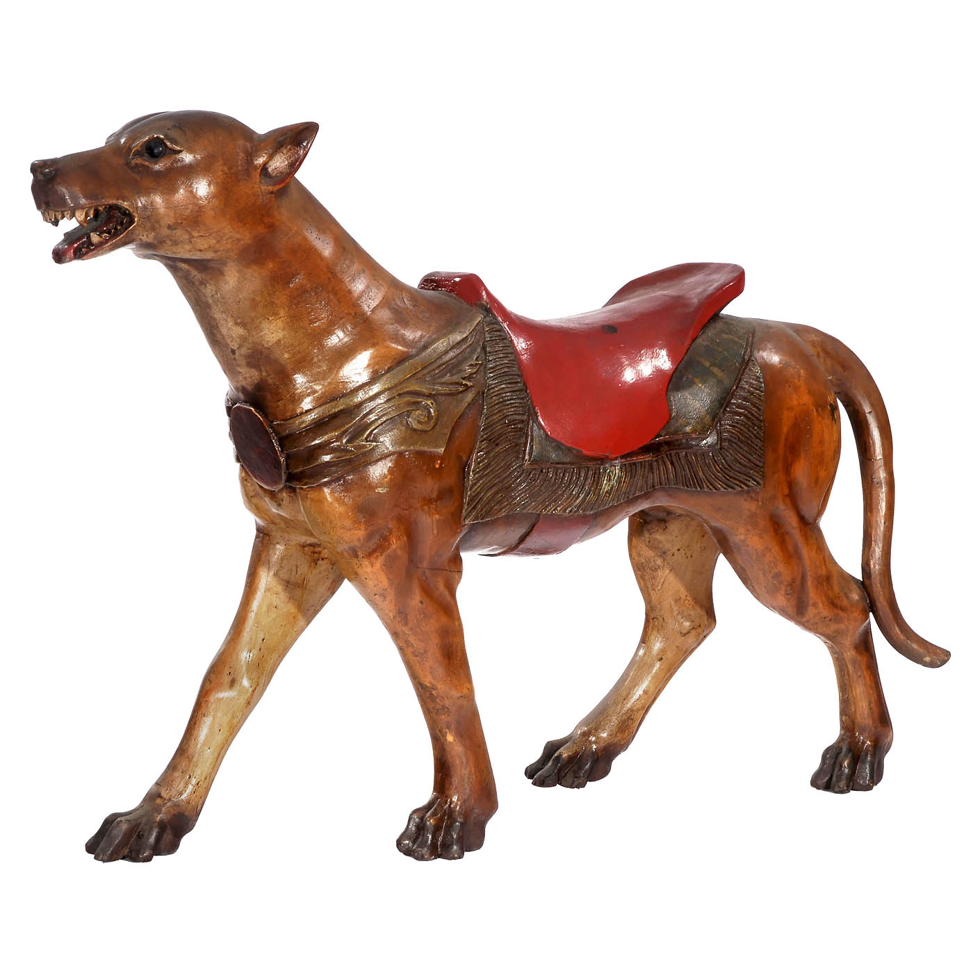 Carved and hand-painted wood, with very expressive face, inset glass eyes, ht. 33 1/2 in. x lg. 49 in. The figure was clearly designed with the fairground in mind but shows no sign of active service on a carousel.