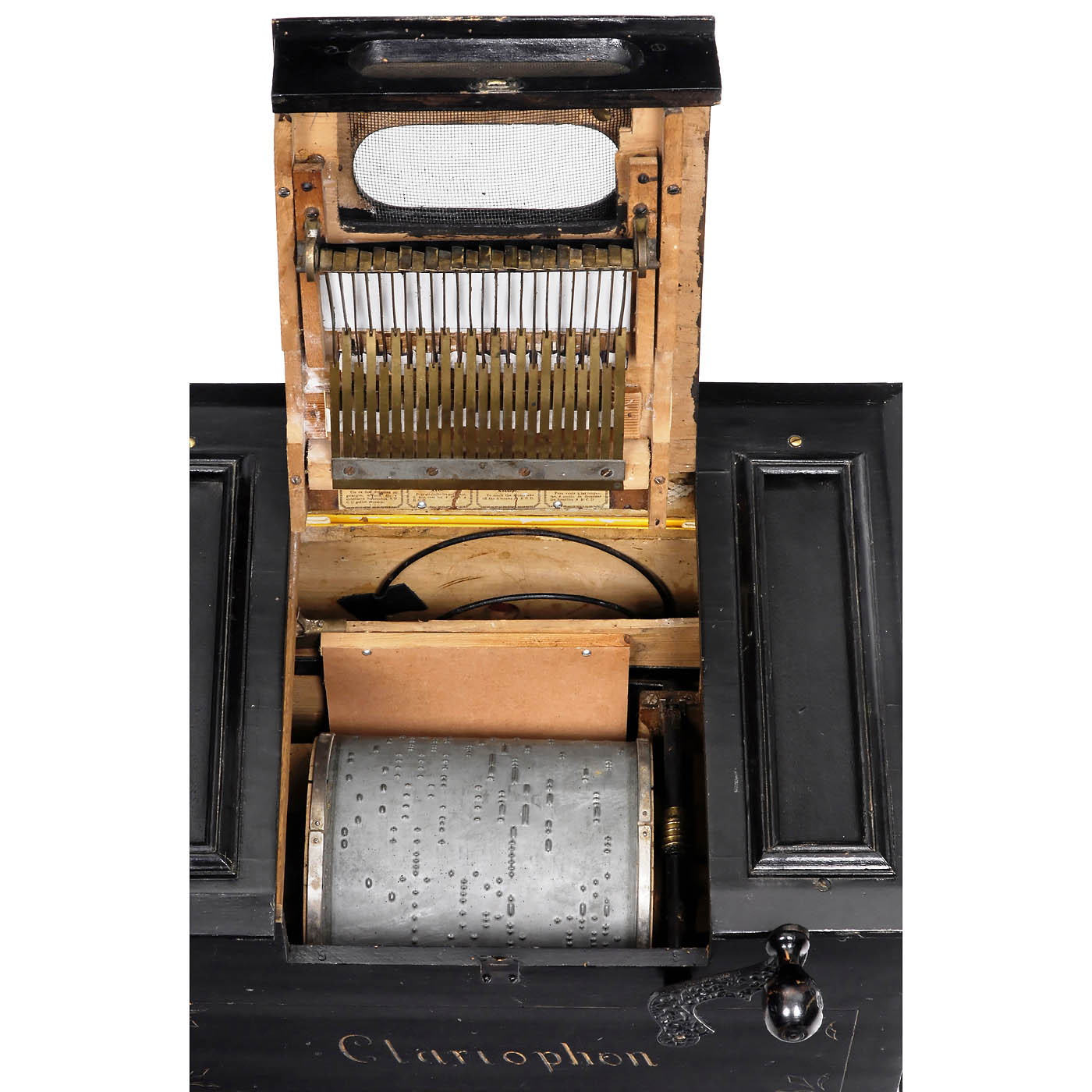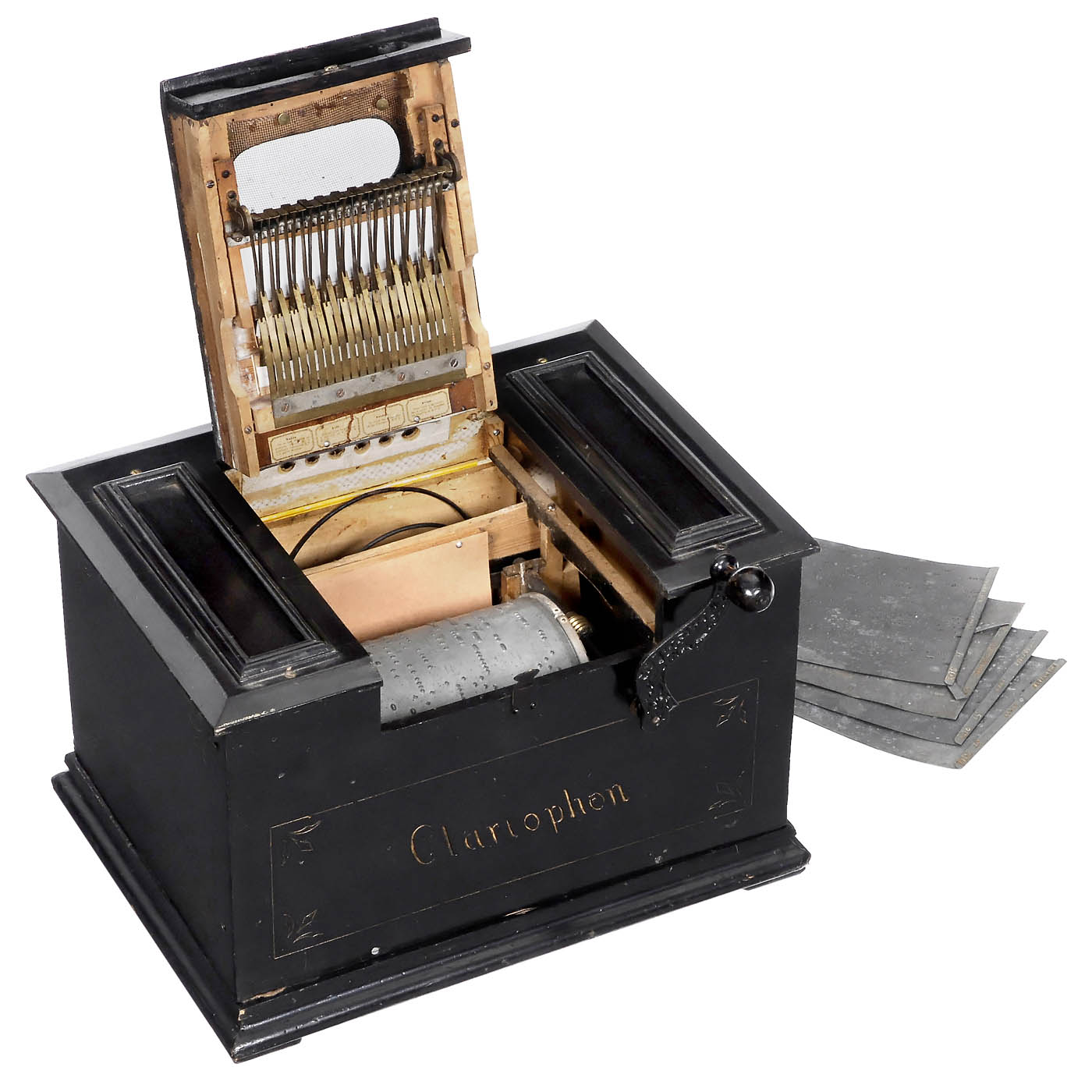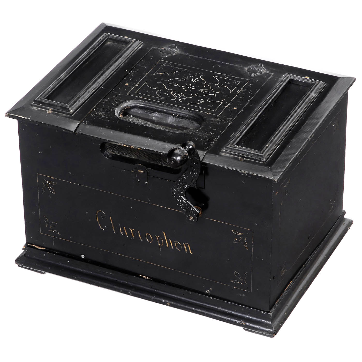 William Späthe, Gera, Germany. For zinc sheets with stamped projections, hand-turned mechanism, black-painted case, original Clariophon lettering, mechanism needs restoration, with 5 music sheets, very rare.