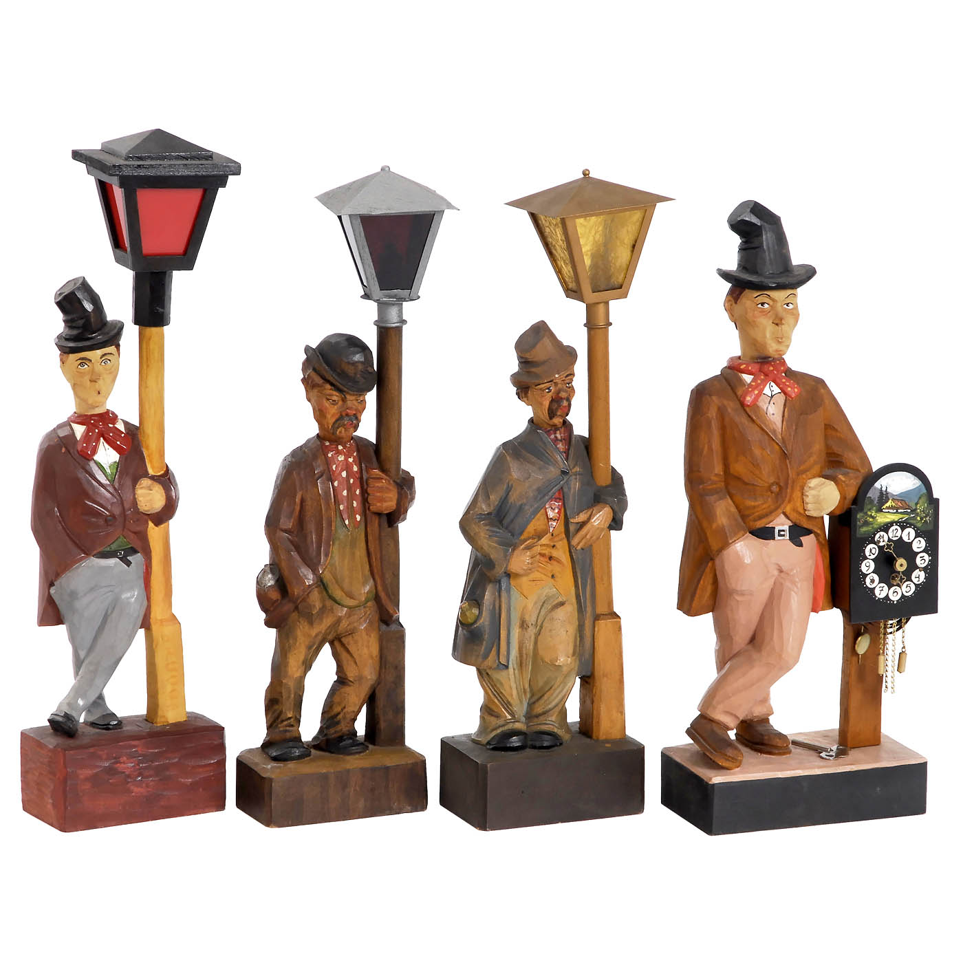 Triberg, Black Forest. With articulated heads, torsos with brass going-barrel movements driving bellows, whistles and cams. 1) Depicting a nonchalant drunkard leaning against the post of a battery-operated street lantern, no. 474, working, the lamp lights, height 19 in., with key. – 2) The same model with different clothing, missing battery compartment cover, mechanism working, melody indistinct. – 3) The same model with different clothing, missing back door and battery compartment cover, mechanism sticks, height 19 ¾ in. – And: 4) Whistler with Black Forest clock, no. 291, missing back door, leaking bellows, height 17 ¼ in.