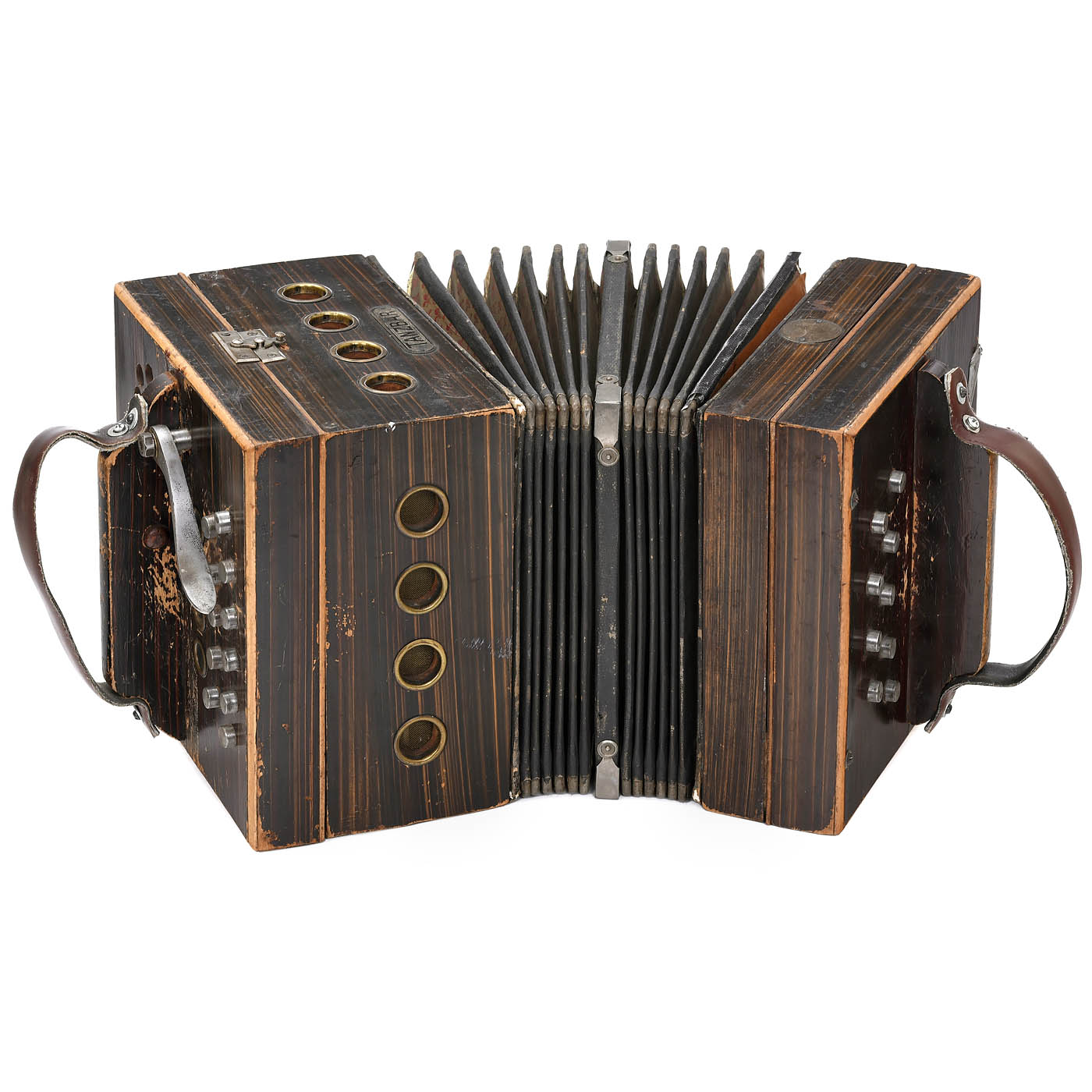 A. Zuleger, Leipzig. Roll-operated player accordion, 16 notes, roll transport via flywheel drive, with rewind crank, working, with 7 rolls (2 damaged). – Very rare small version of the Tanzbär in a square case.