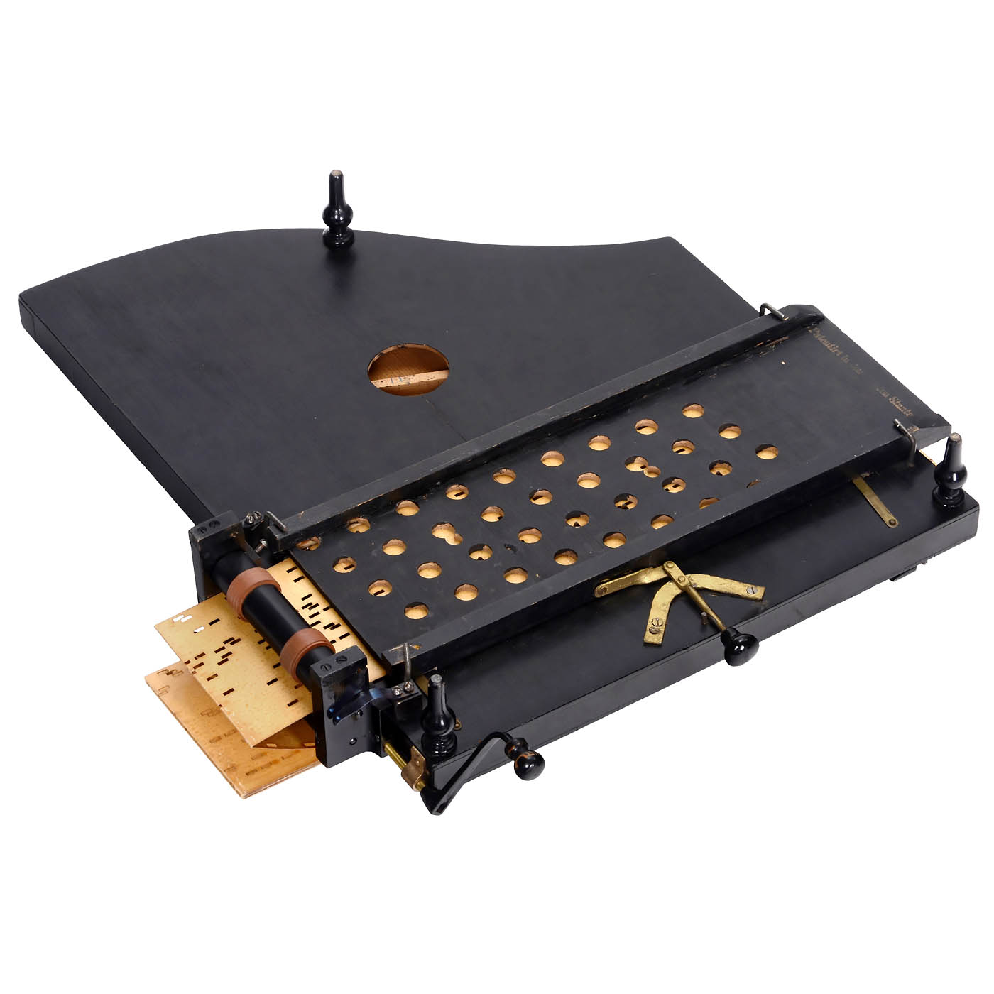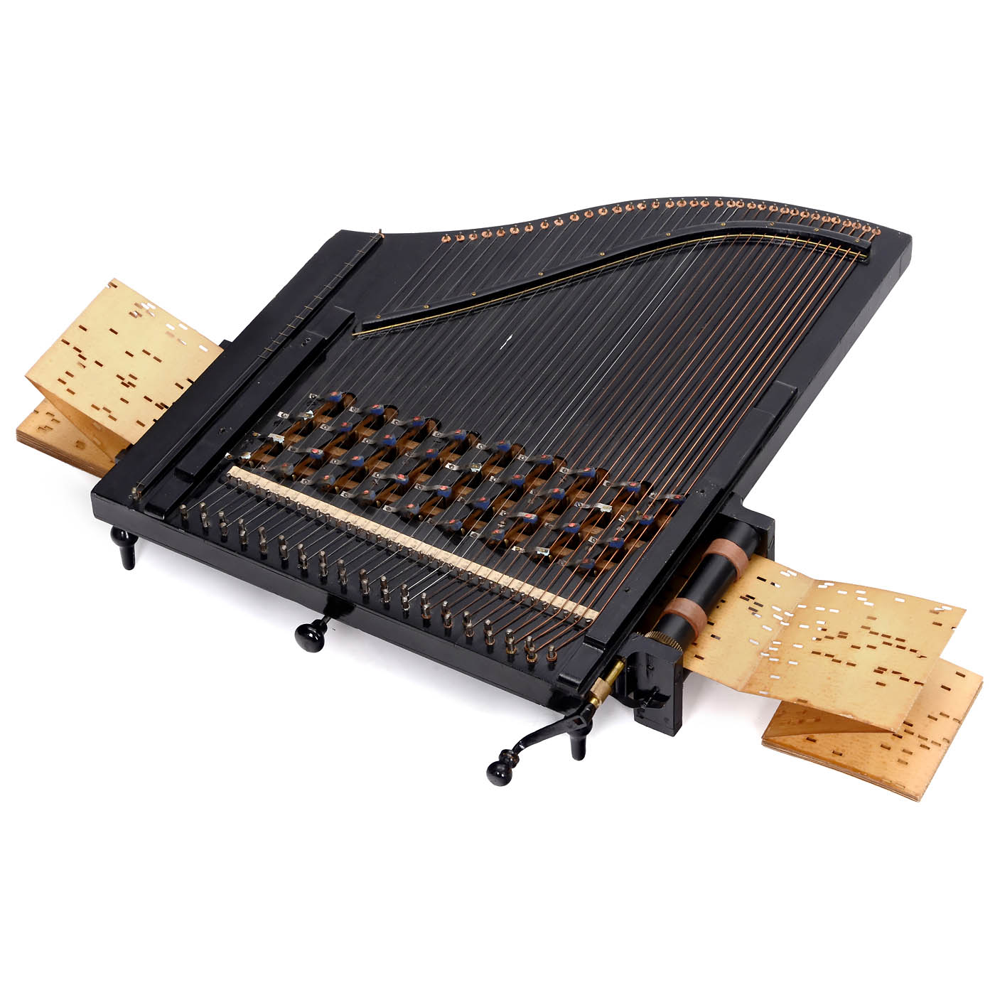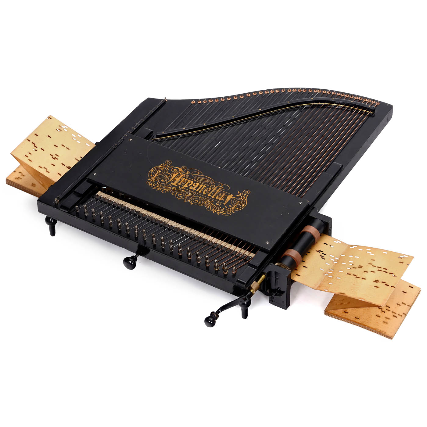 Ludwig Hupfeld, Leipzig. For interchangeable card music books, with hand-turned 36-note mechanism activating automatic plucking of the melody and accompanying strings, dimensions 26 x 22 ½ in., works partially, in need of tuning, with a music book.