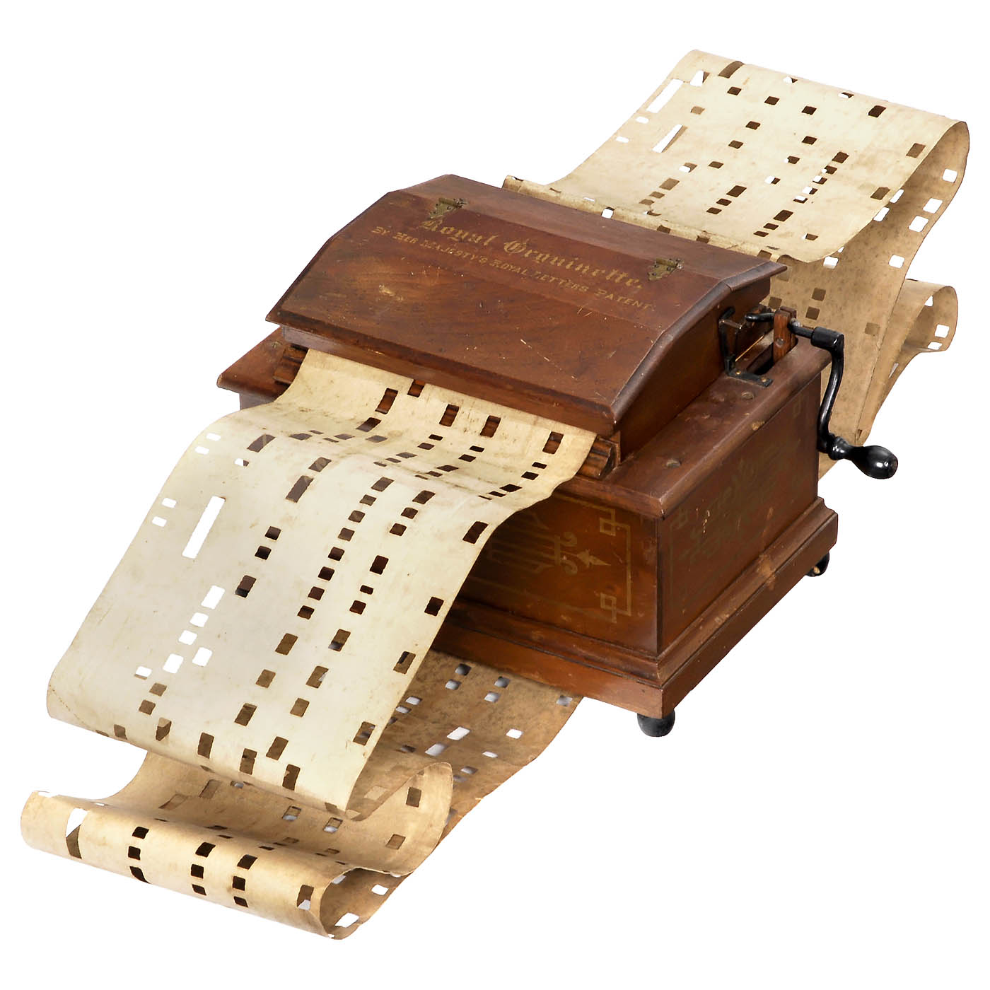 1) "American Orguinette", with label "The National Mechanical Orguinette", 14 notes, works, with 4 paper strips. – 2) "Royal Orguinette", 14 notes, plays too softly, without music strips. – 3) "Ariosa II" table organ, organette with music rings, by Leipziger Musikwerke Phoenix, Schmidt & Co, with 18 reeds, ebonised wood case with original decals, dimensions 14 x 12½ x 7 in., case damaged, needs more air pressure. – And: 4) "Diana" table organ, no. 12331, by Phoenix Musikwerke, Leipzig, for 6 ¼ in. metal discs, 14 notes, plays too softly, with a disc.