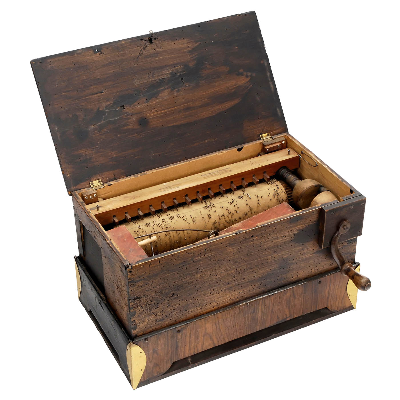 Unmarked, 14 notes, 8 tunes, hand-turned mechanism on wood worm gear, base with 14 stopped pipes (replaced), case with wormholes, good playing condition, size 19 x 11 x 11 in.