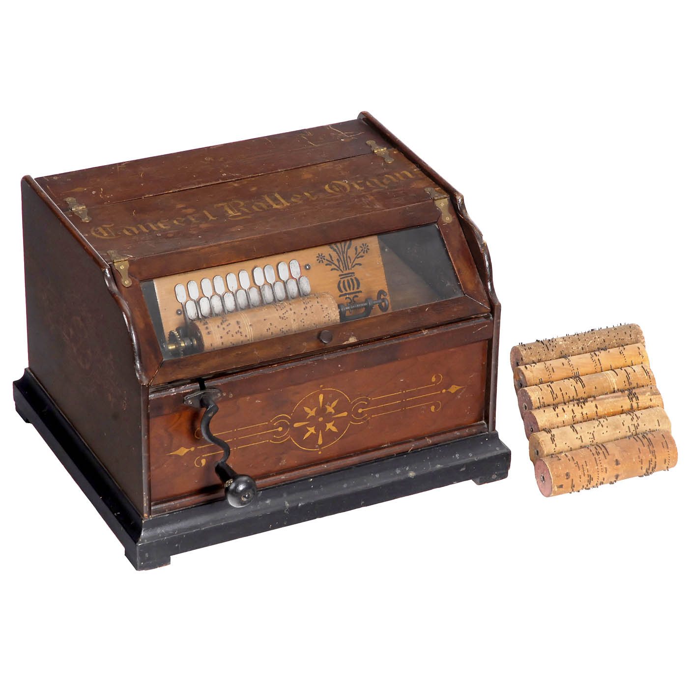 The Autophone Company, New York, organette with 20 notes, for helical pinned wood cobs playing one air on three revolutions, gilt-stencilled wood case, size 18 x 15 x 12 ¼ in., very good playing condition, with 7 cobs.