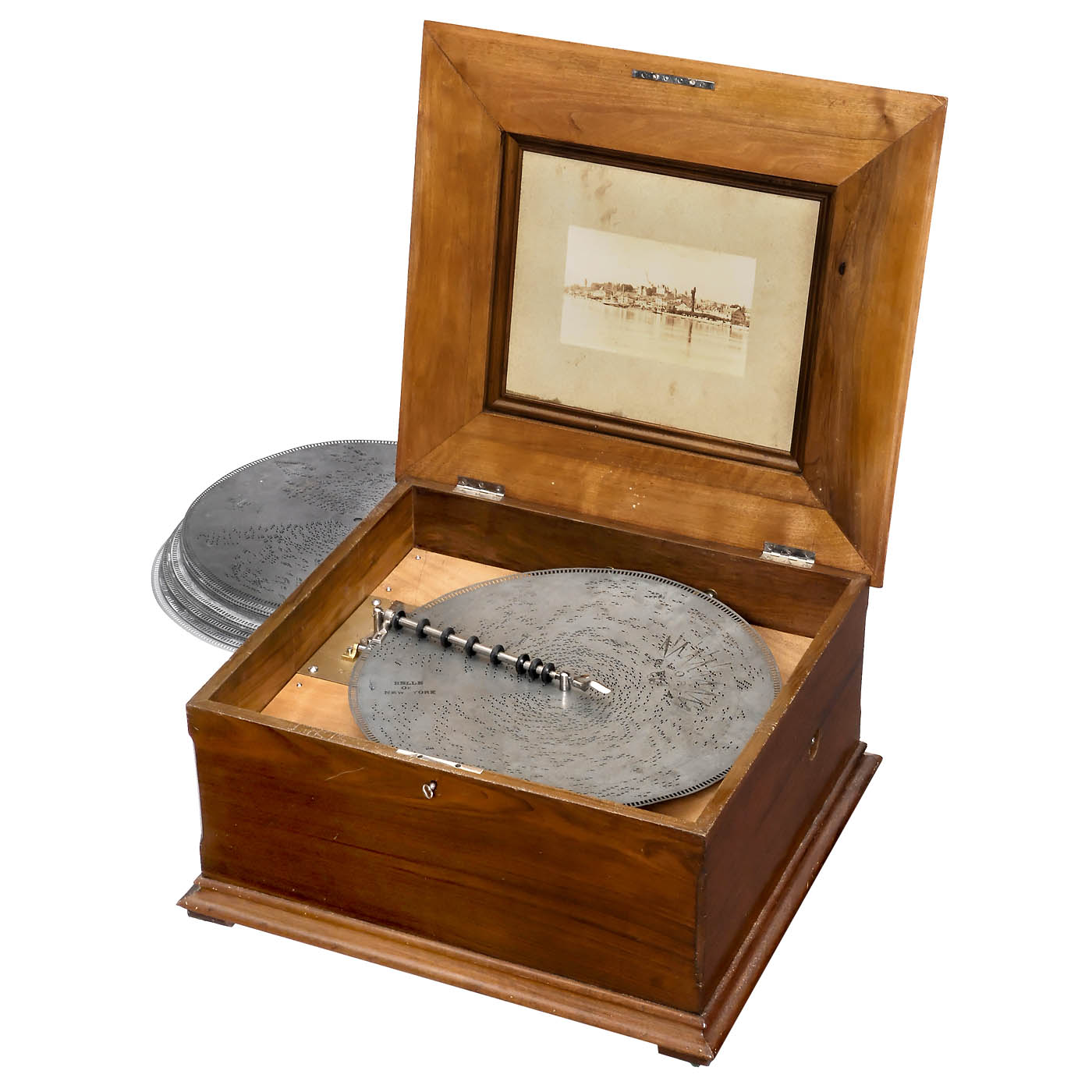 Paillard & Cie, Ste Croix, Switzerland. For 18 ½-inch discs, 100 teeth in two music combs (complete), walnut case, lid probably modified, size 25 x 22 ½ x 11 ¾ in., very good playing condition, missing crank, with 19 discs.