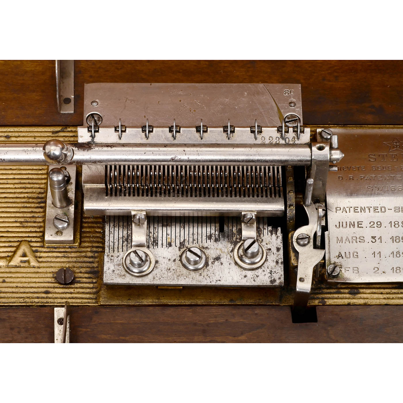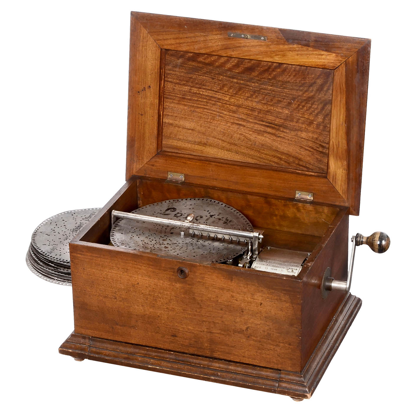 1) Stella, no. 22304, Mermod Frères, Switzerland, for 9 5/8-inch projectionless discs, 80 teeth in two combs (3 broken), walnut case, drawer for the discs, playing, with 27 discs. – And: 2) Symphonion no. 48GI, Symphonion Musikwerke, Leipzig, for 10-inch discs, 48 teeth in steel comb (complete), 6 saucer bells, walnut case, mechanism partially rusty, playing, with 44 discs (also partially rusty).