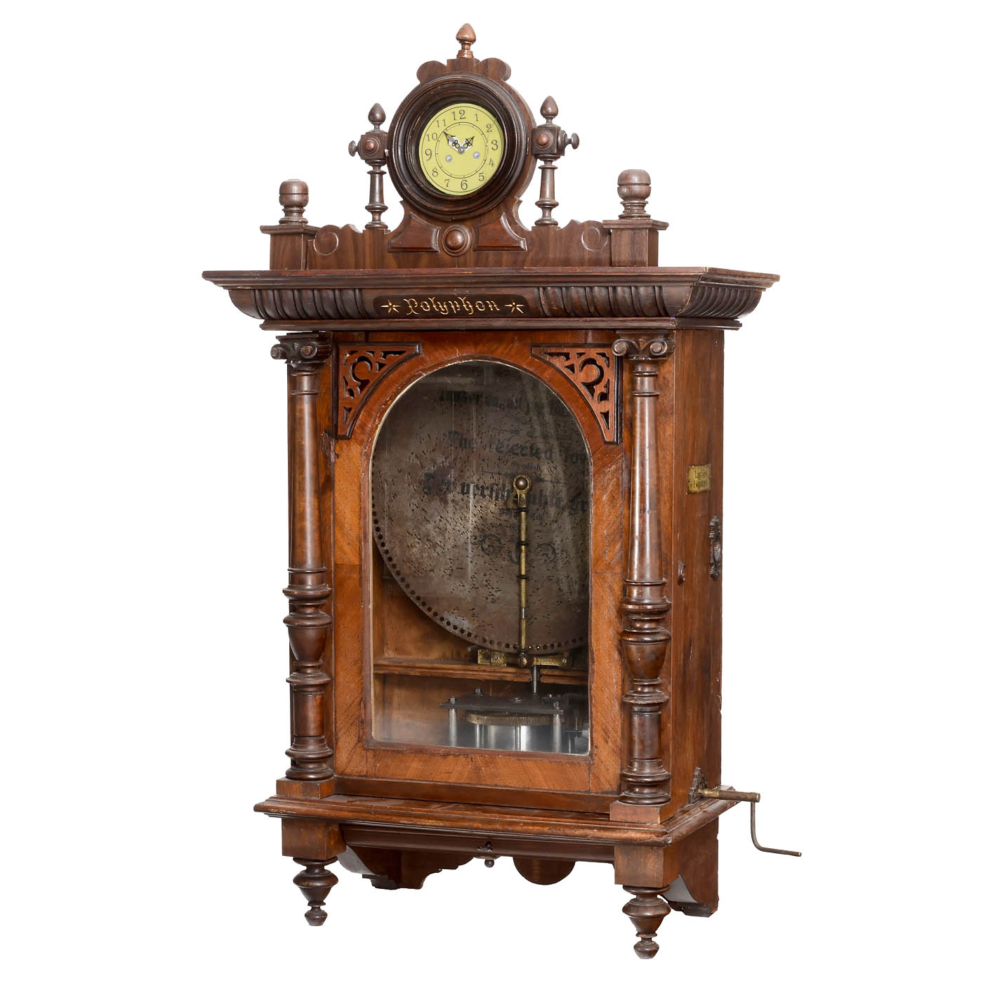 Polyphon Musikwerke, Leipzig. For 19 5/8 in. discs, coin unit incomplete, 118 teeth in duplex comb (complete), walnut case, height 38 in., motor defective, pediment added, missing clock, with 1 disc.