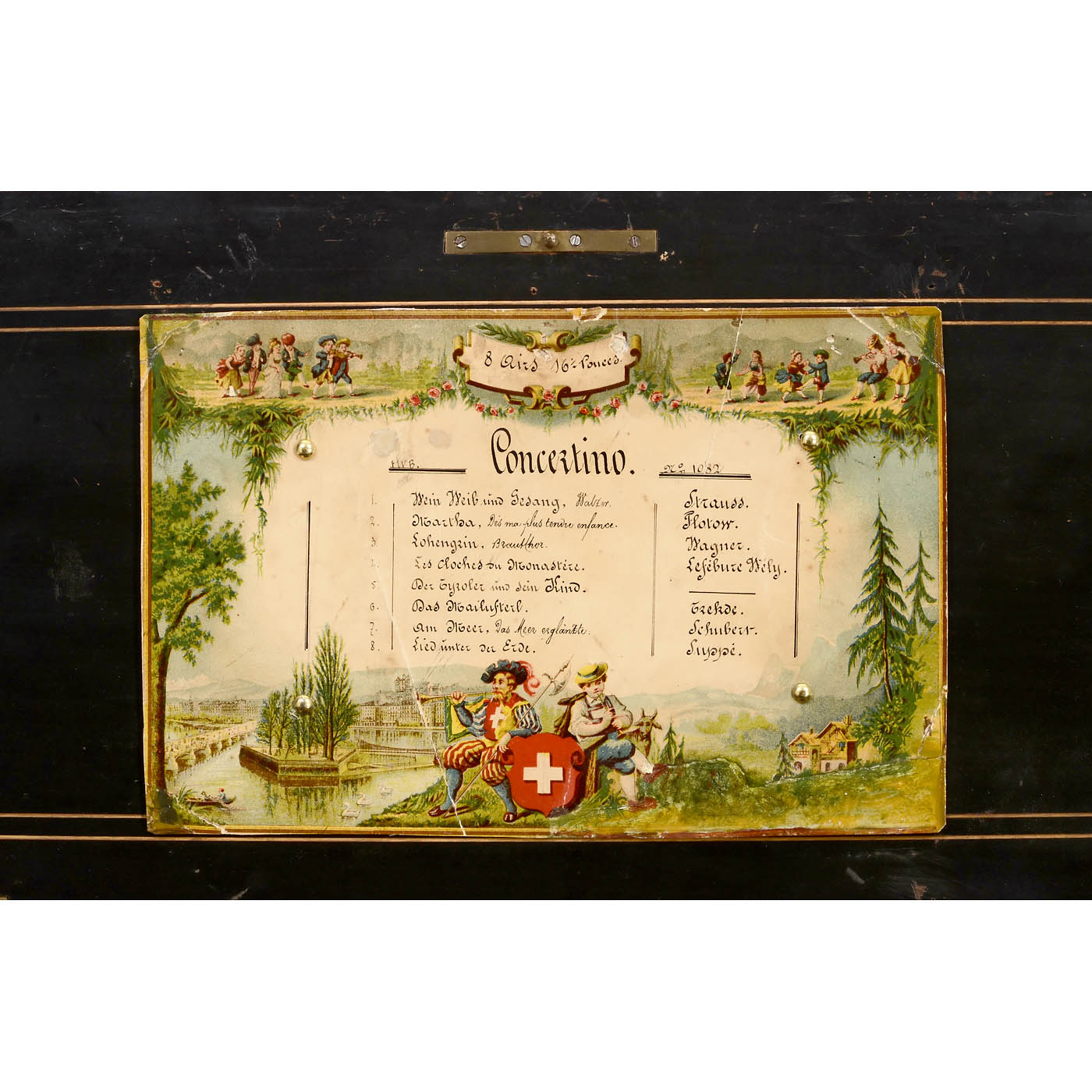 No. 13787, playing 8 popular airs, with two combs of 34 and 88 teeth (piccolo comb with one bent tooth and one missing tip, bass comb with six missing or poorly repaired tips), zither attachment, tune-indicator and "Isle Rousseau" tune-sheet, in grained case with veneered and inlaid lid and re-veneered front, wd. 27 ½ in. (70 cm), cylinder 17 ¼ (43.5 cm), later ormolu handles, cylinder out of register, an unusual format – worthy of restoration.