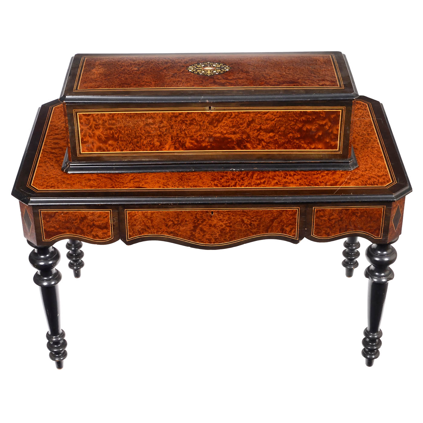Thuya-veneered case with ebonized borders, cartouche inlay of brass and mother-of-pearl on lid, matching table with baluster-turned legs and storage drawer for six cylinders, internal dimensions of case wd. 32 x dp. 10 5/8 in. (81 x 27 cm), table 46 3/4 in. (119 cm) wd., for a movement with approx. 12–13-inch cylinder (30.5–33 cm), overall good, sections of brass missing from lid inlay, without handles and internal case dividers.