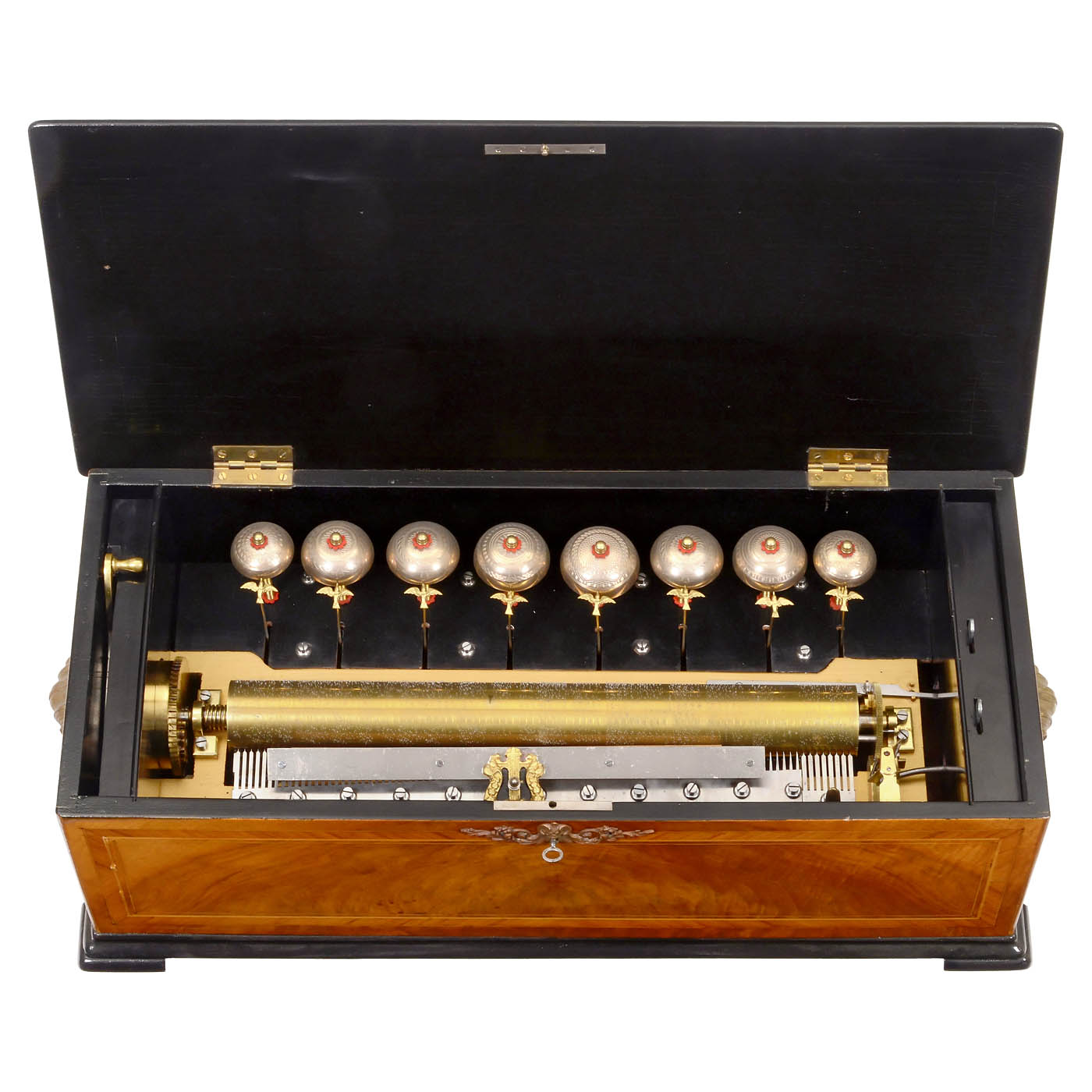 No. 8026, possibly Junod, playing 12 airs accompanied by 8 optional engine-turned bells with bird strikers, with 85 teeth in the musical and 8 teeth in the percussion combs (both complete), ratchet-wound coaxial spring, zither attachment and burr-walnut-veneered case with book-matched front and quarter-veneered lid, wd. 30 in. (76 cm), cylinder 19 ½ in. (49.5 cm), good restored playing condition, case sides with later matching veneer.