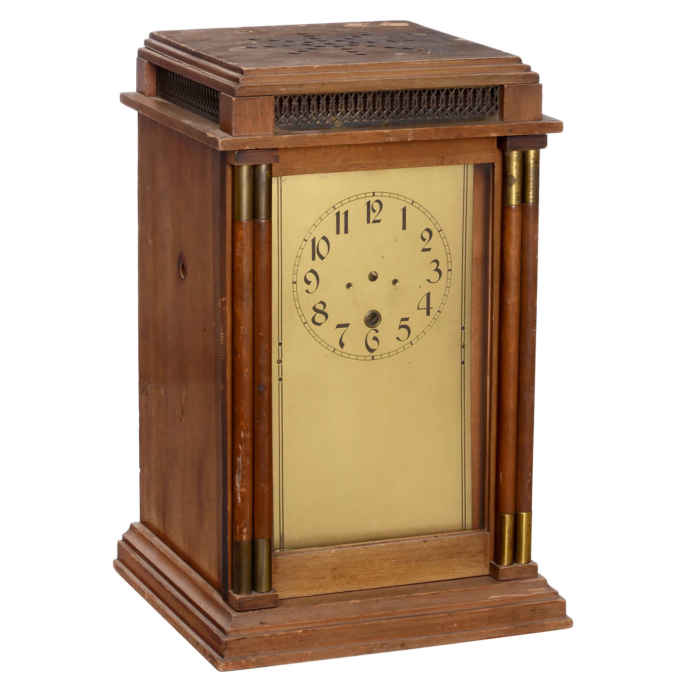 With reproducer and horn, missing hands and crank, tape included but damaged, untested. Note: The Berlin designer B. Hiller built this time announcement clock, equipped with a phonograph mechanism and a celluloid strip with vertical sound track. All 48 quarter hours (from 0 to 12 o'clock) are recorded on it, read by the reproducer and announced via a small horn. The time announcement was in German. For export, there were strips in foreign languages. If desired the time announcement could be repeated several times for late risers. – Very interesting collector's item! – Literature: D. Marty, "Grammophone", 1981, p. 170.