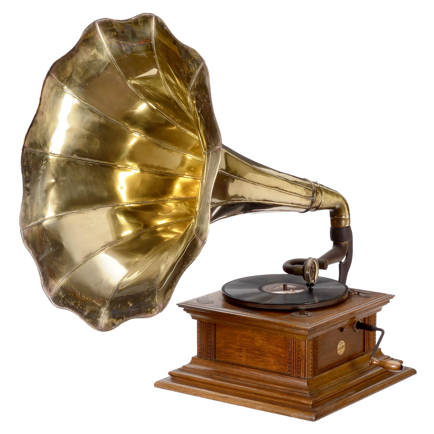 The Gramophone & Typewriter Ltd., London. Original brass horn, Ø 23 in., replacement spring motor, Exquisit soundbox, carved oak case with maker's transfer, crank repaired, tone arm somewhat rusty, good playing condition.