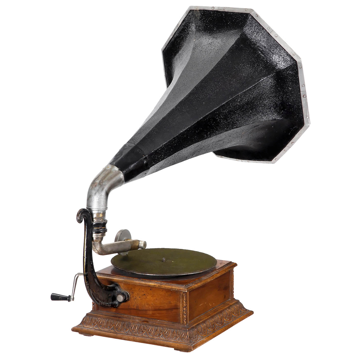 Pathé, Paris. For horizontally-cut records, walnut case with Pathé transfer (athlete and globe), Sonata mica reproducer, large bench-made papier-mâché horn, Ø 17 in., good playing condition.
