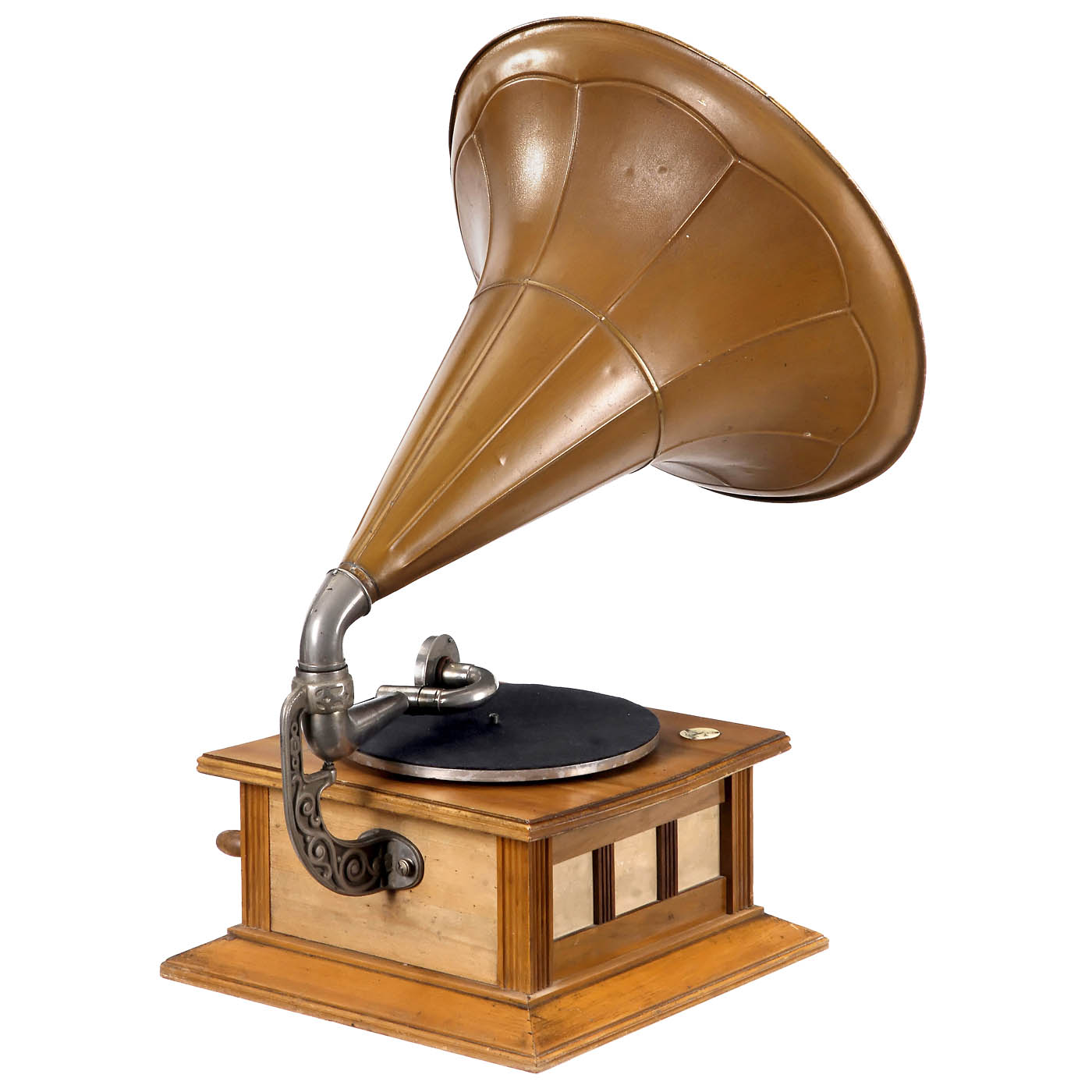 Light oak case with Triumphone trademark plaque, 10-inch turntable, Exact mica soundbox, original lacquered metal horn, Ø 18 in., working condition.