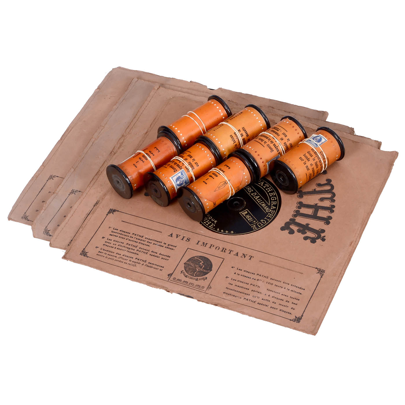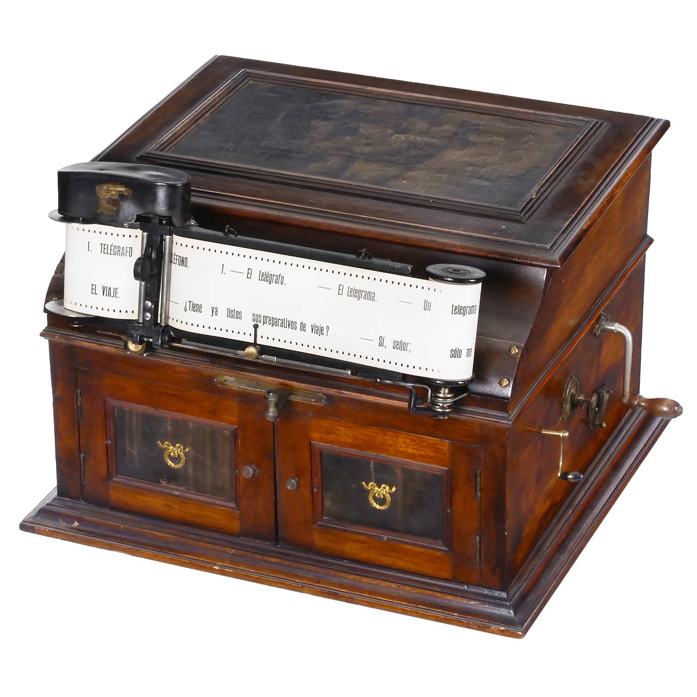 French language-teaching machine, for vertically-cut Pathé discs and paper text tapes, wood case, horn behind two doors, synchronized transport mechanism for the paper text spool and the record. – With eight text spools (Spanish) and four records (German). – Working condition.