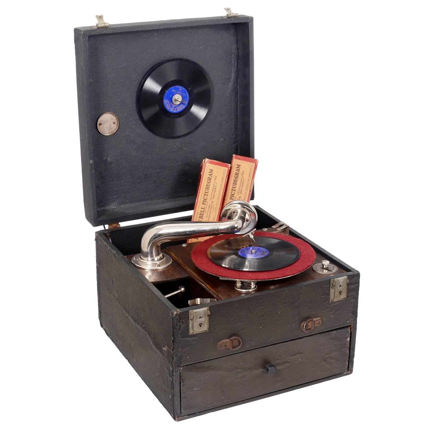 Edison Bell Ltd., London. Rare portable panorama gramophone with moving picture spools, with spring-motor for both functions, removable oak-framed picture aperture stowing as a drawer during transport, 8-inch turntable, Era soundbox and leatherette-covered case, with 2 records and 3 unmatching double-sided film strips, excellent working condition. – Note: The machine offered here is the second model, with distinctive 8-inch turntable and motor assembly located closer to the front of the case: a rare variation! – Literature: Ch. Proudfoot, "Grammophone und Phonographen", Munich 1981, p. 71.