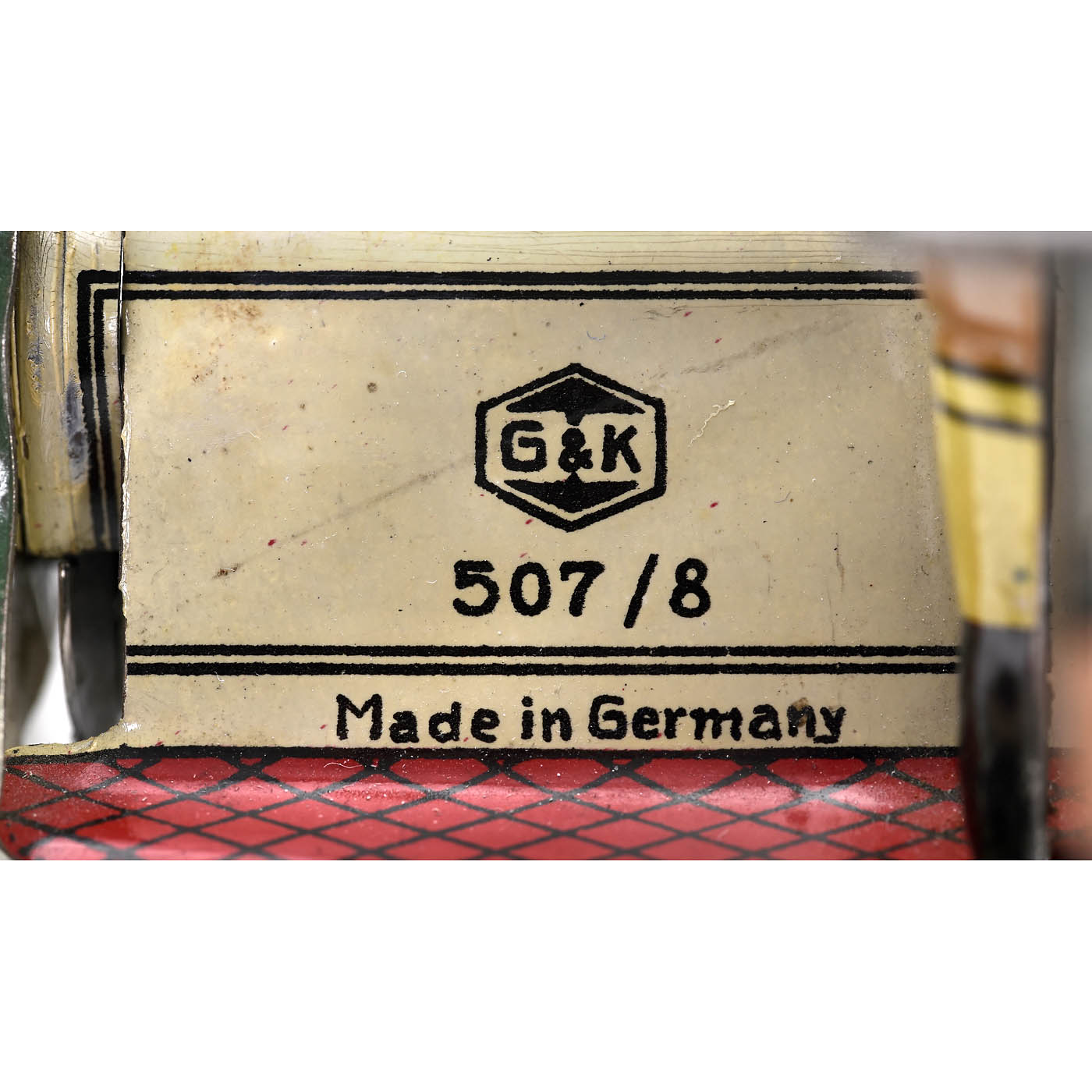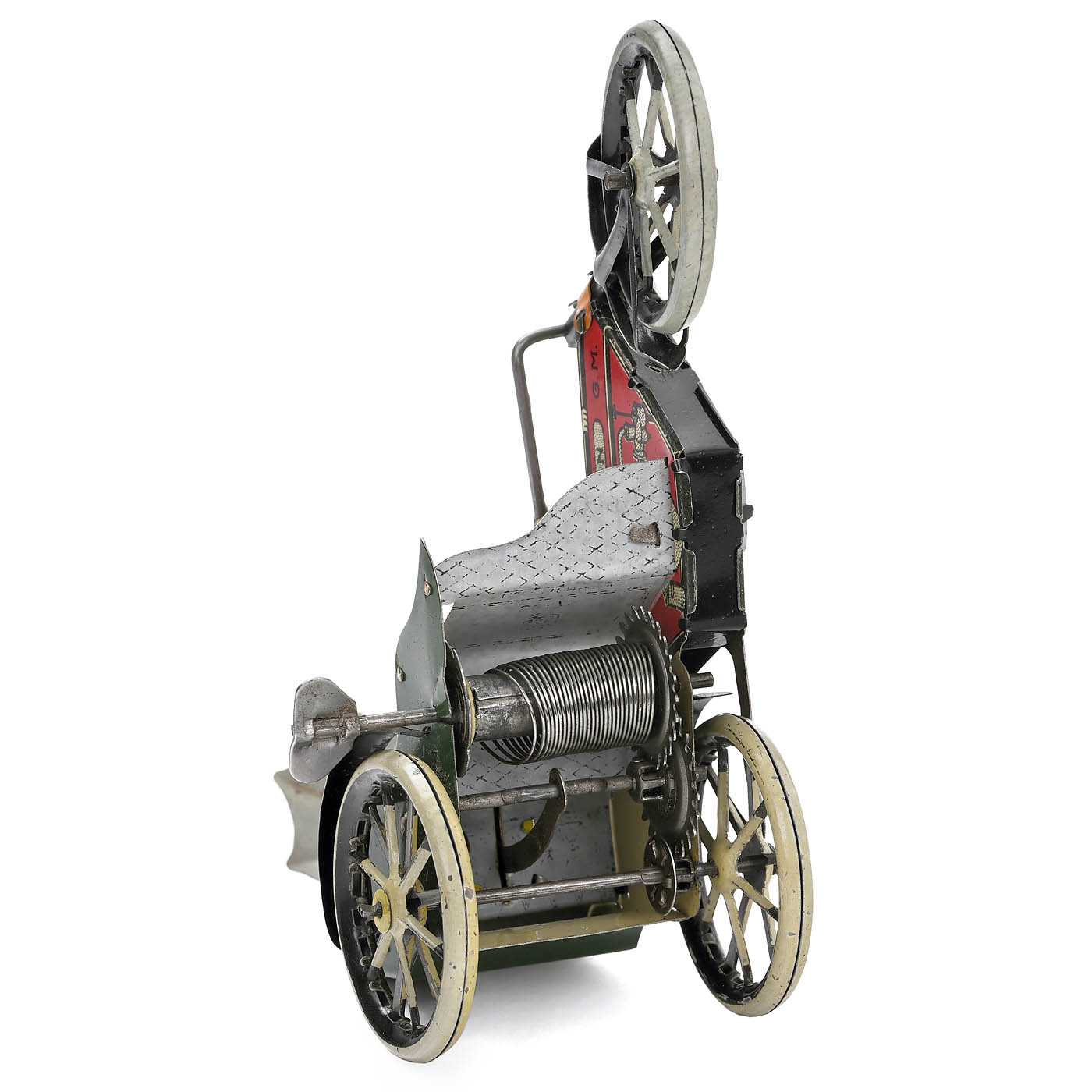 No. 507/8, Gundka Werke, Brandenburg, Germany, early clockwork lithographed tinplate toy, featuring a uniformed driver and female passenger with moving parasol, length 6 ¼ in., driver’s left arm replaced, otherwise in excellent working original condition. – This motorcycle toy is based on the Cyclon Racing Motorcycle produced 1912–1917 by the Joerns Motor Manufacturing Company, USA. Extremely rare!