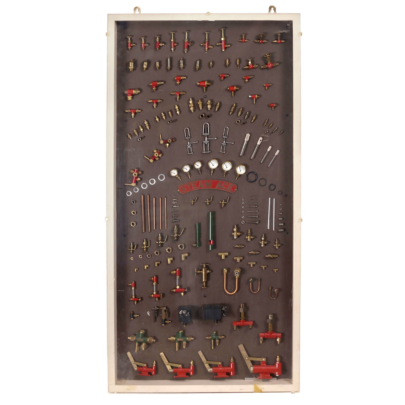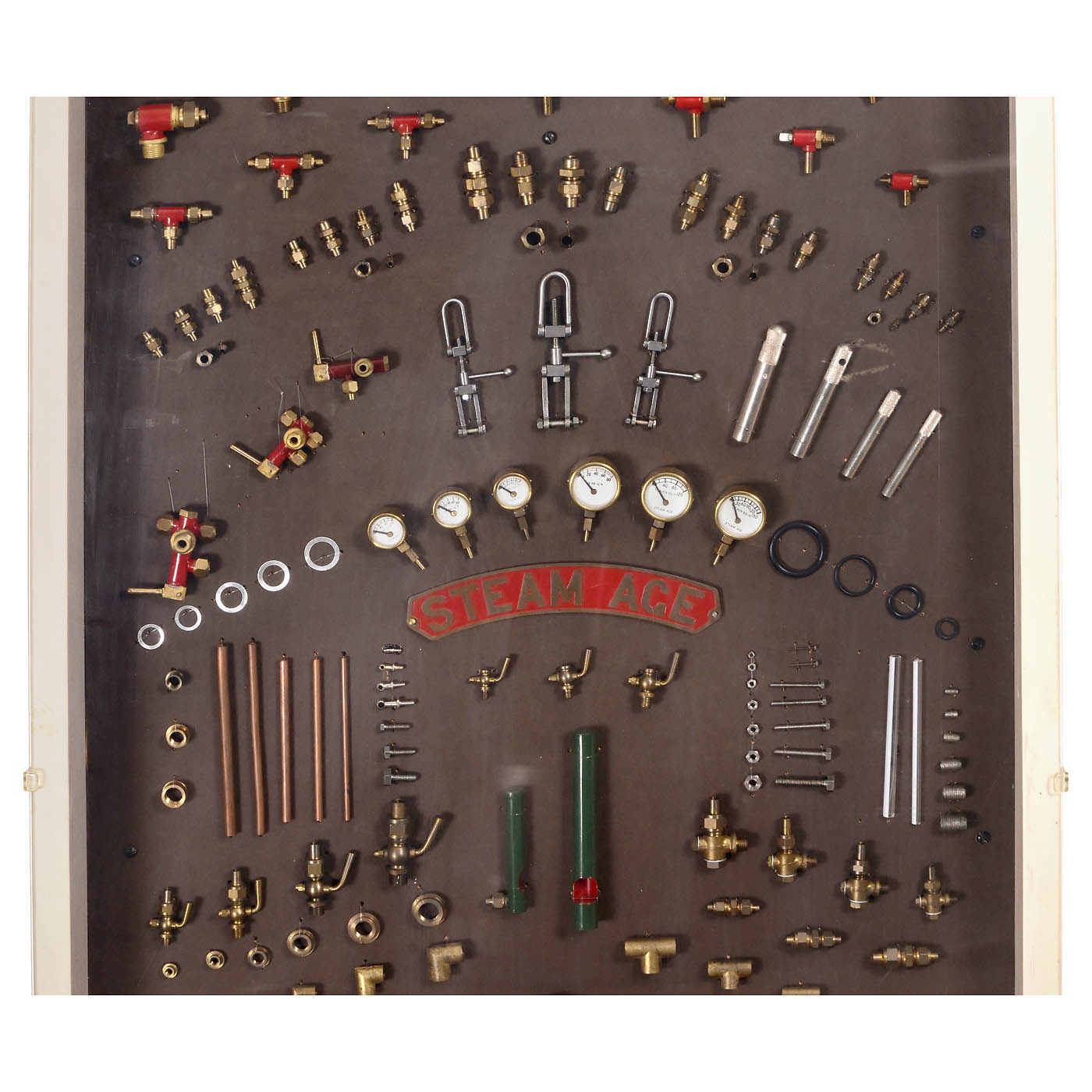 Steam Age, approx. 150 parts, with stopcocks, three-way connections, manometers, steam whistles, oil pumps, water level glasses, feed pumps and many other parts, for wall-mounting, dimensions 19 5/8 x 37 1/3 in.