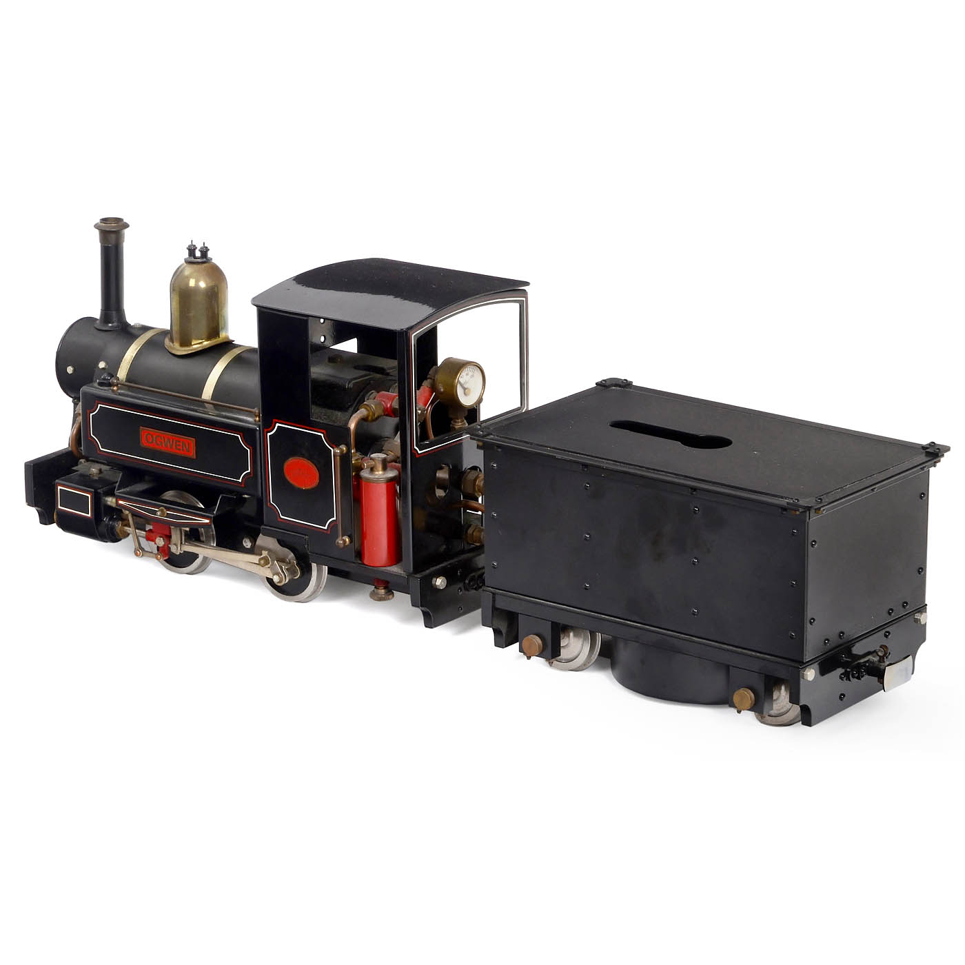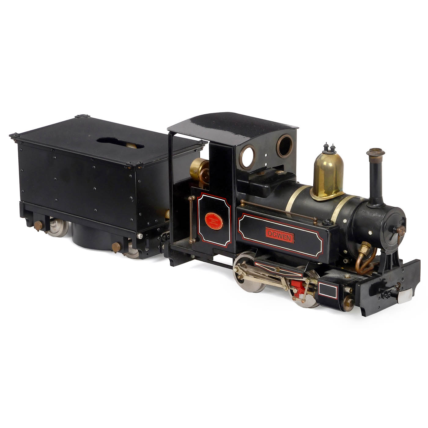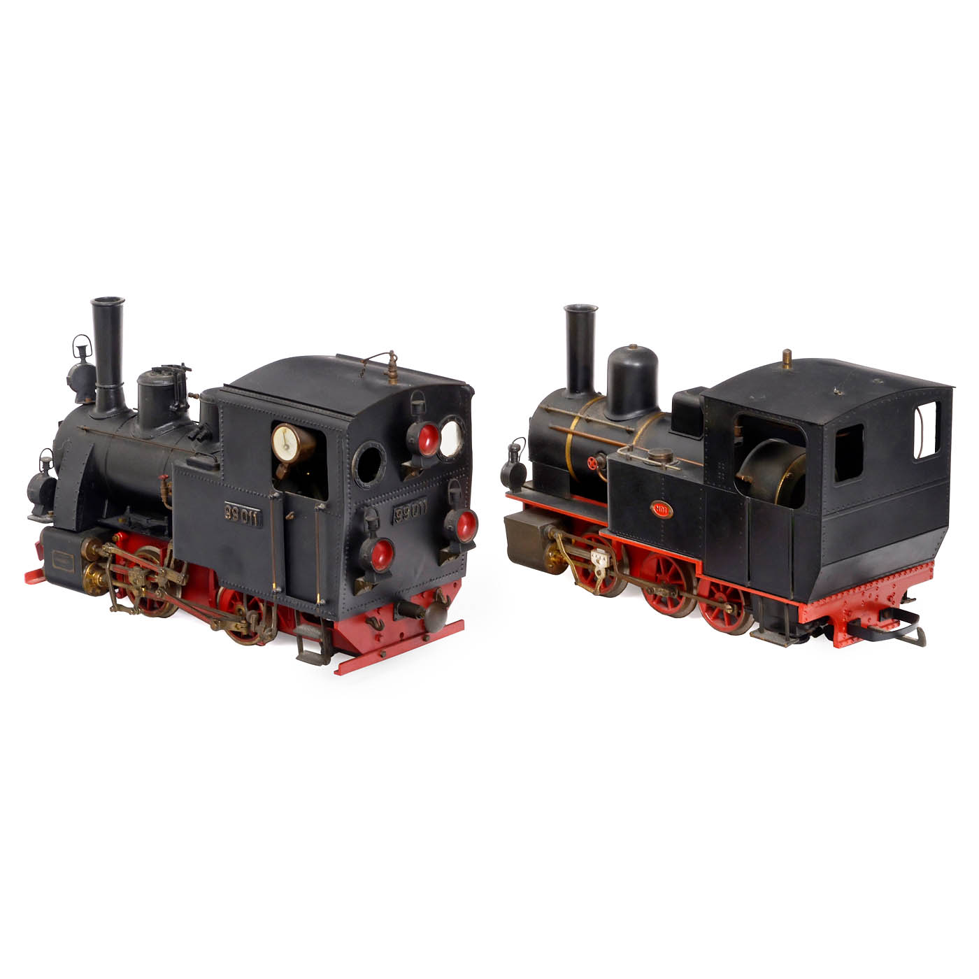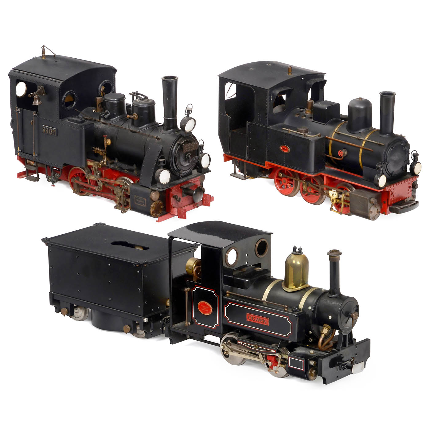 1) Class 99011, tank locomotive, Regner Dampftechnik in Aurach, factory-built gauge of a Palatine PtS 2/2, gas-fired, 2 outer cylinders, unfired condition, length 10 5/8 in. – 2) Tank locomotive "MDT", 3 axles, 2 cylinders, spirit-fired, unfired condition, missing burner, length 10 ¼ in. – And: 3) Tender locomotive "Ogwen", Maxwell Hemmens, Engineers, Thorganby, York, 1:20 scale model of the 1933 industrial locomotive used mainly at Penhryn Quarries in Wales, gas-fired, unfired condition, overall length 16 ½ in.