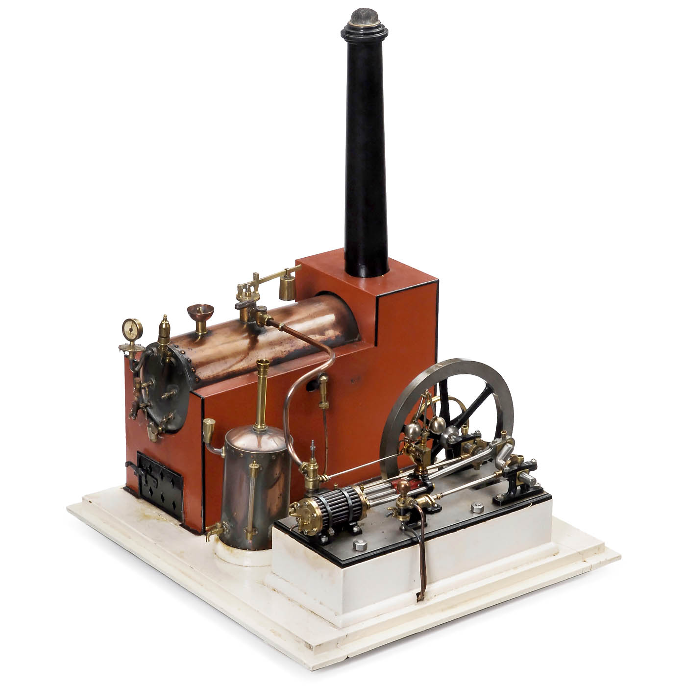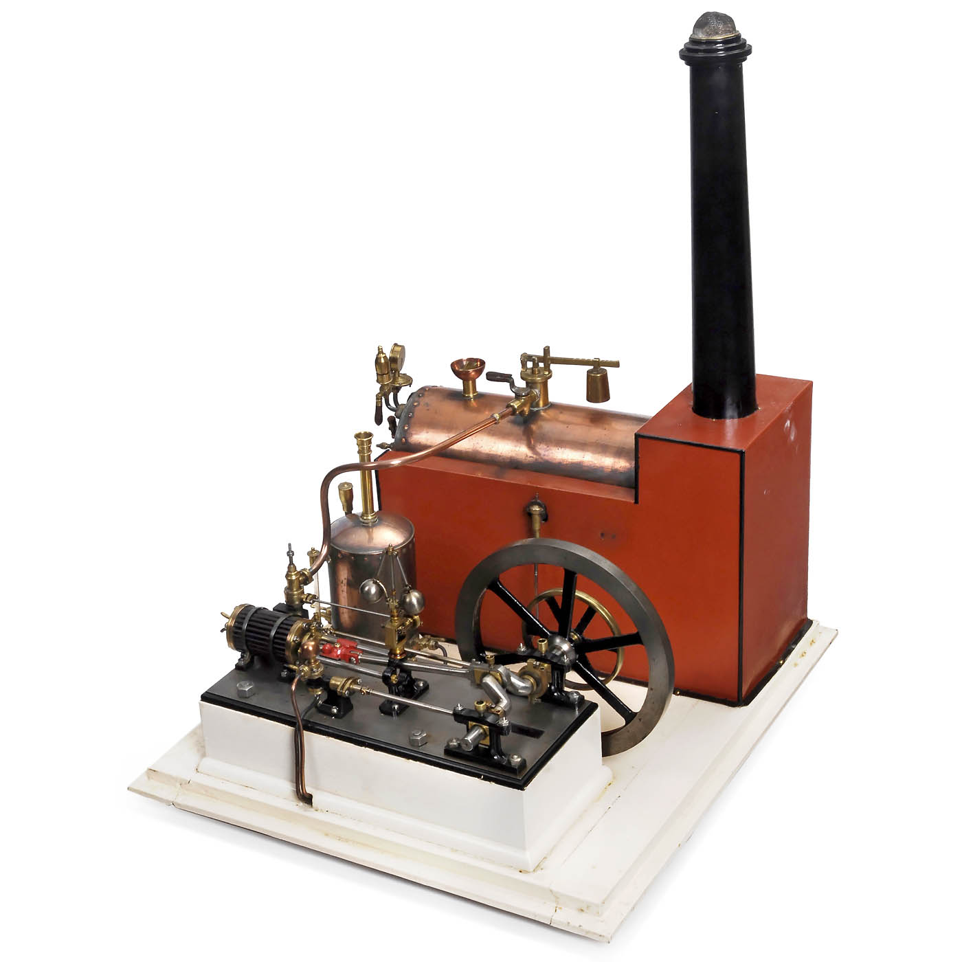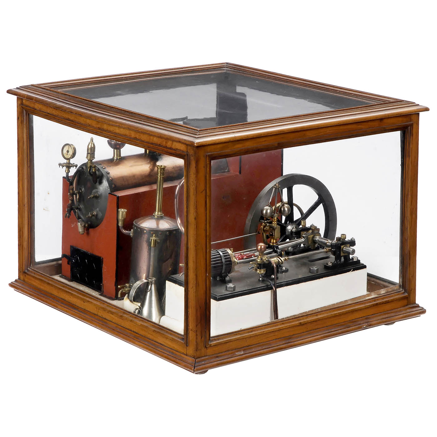 Riveted brass boiler, Ø 4 in., with water level glass, manometer, steam whistle and weighted safety valve, for spirit heating, burner missing, wood-planked cylinder, Ø 1 ½ in., slide control, working speed regulator, belt missing, feed pump, brass water tank, 7 in. flywheel, on wood base, basic dimensions 18 x 16 ½ in., under five-sided glazed display case with profiled walnut frame, tested with compressed air, working.