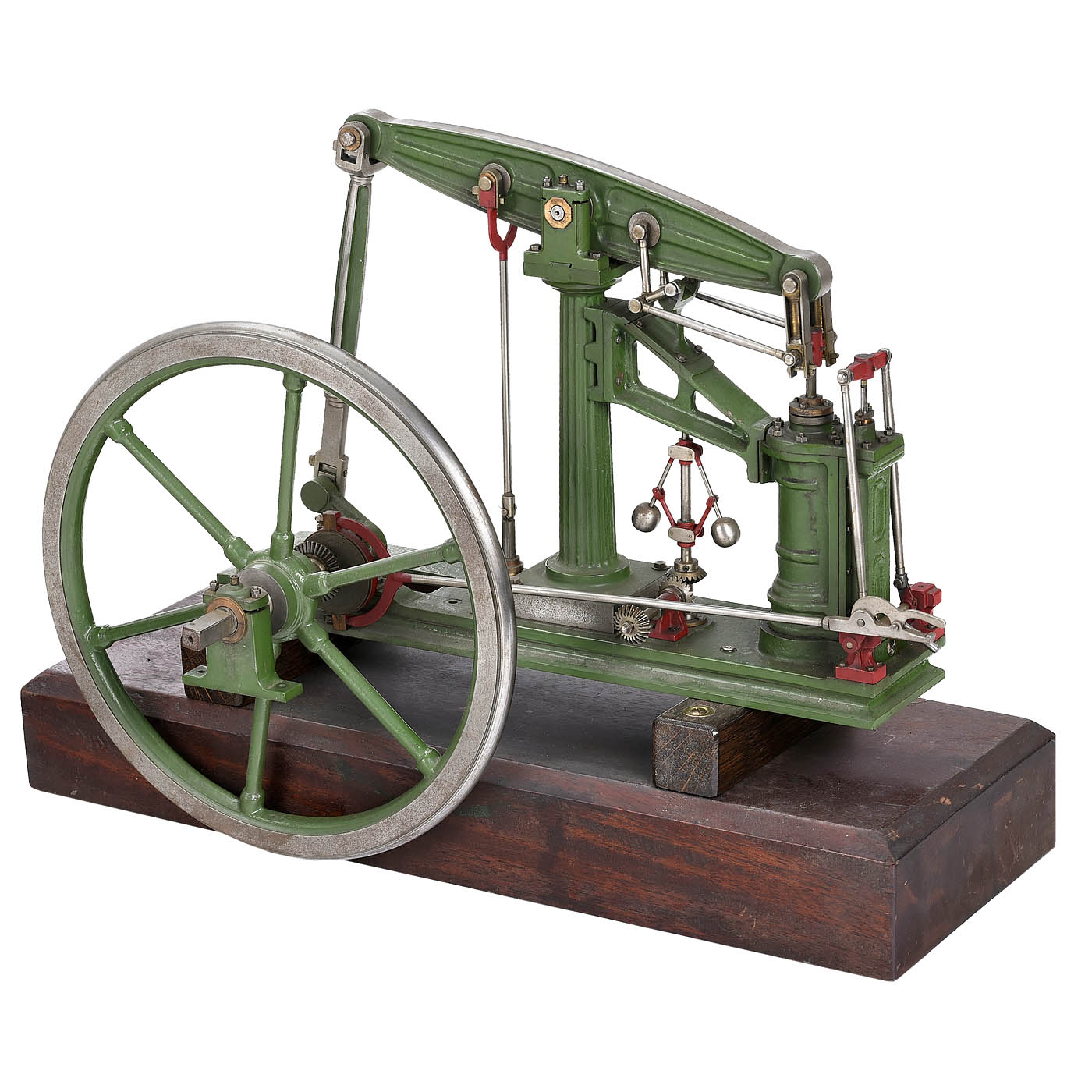 England, cast iron, steel and brass, overhead walking beam with parallel motion, bronze single cylinder, Ø 11/3 in., spoked 10 in. flywheel, valve control with eccentric ring, reversible, governor without function, on wood plinth, overall 17 ¾ x 6 ¾ x 13 in., somewhat resinous.