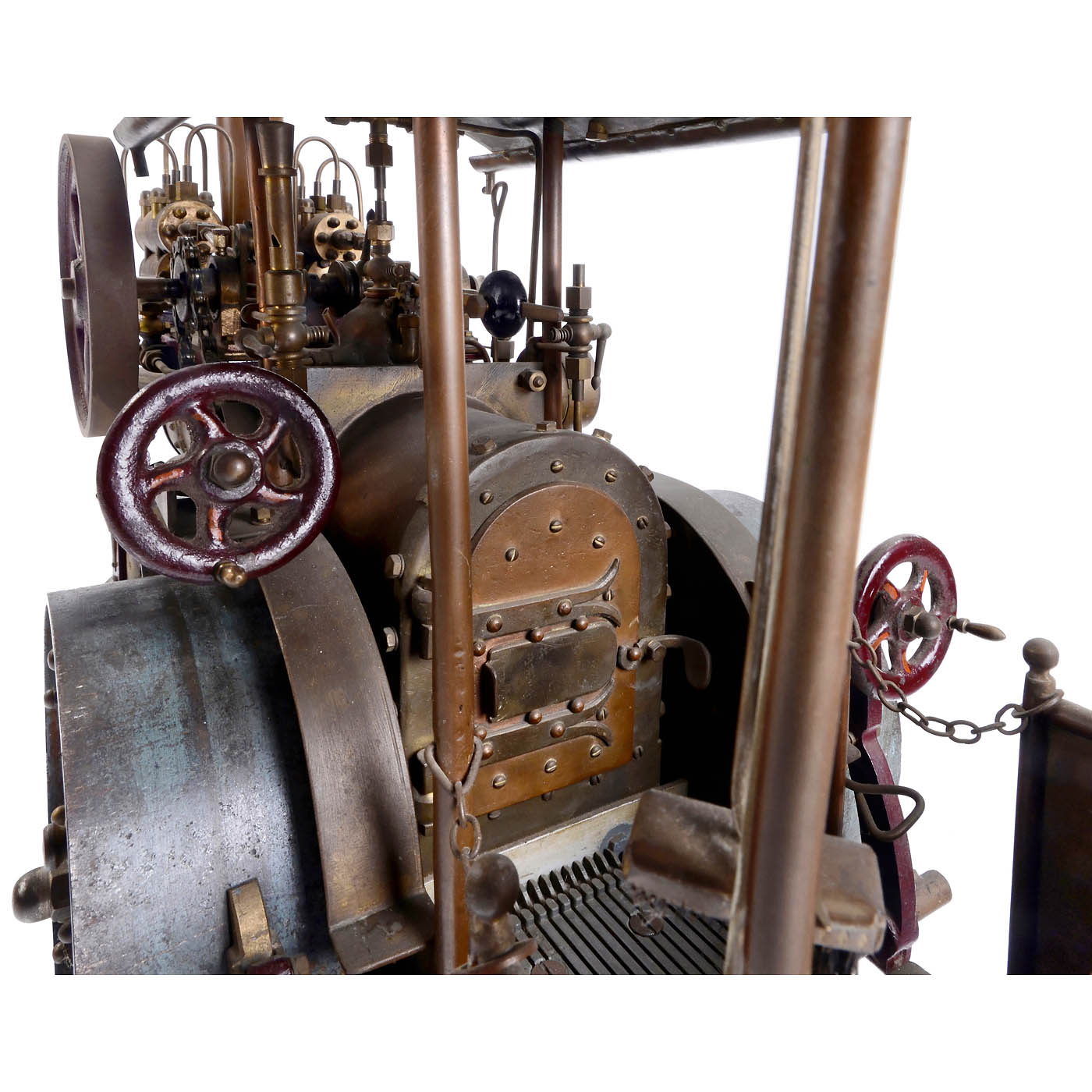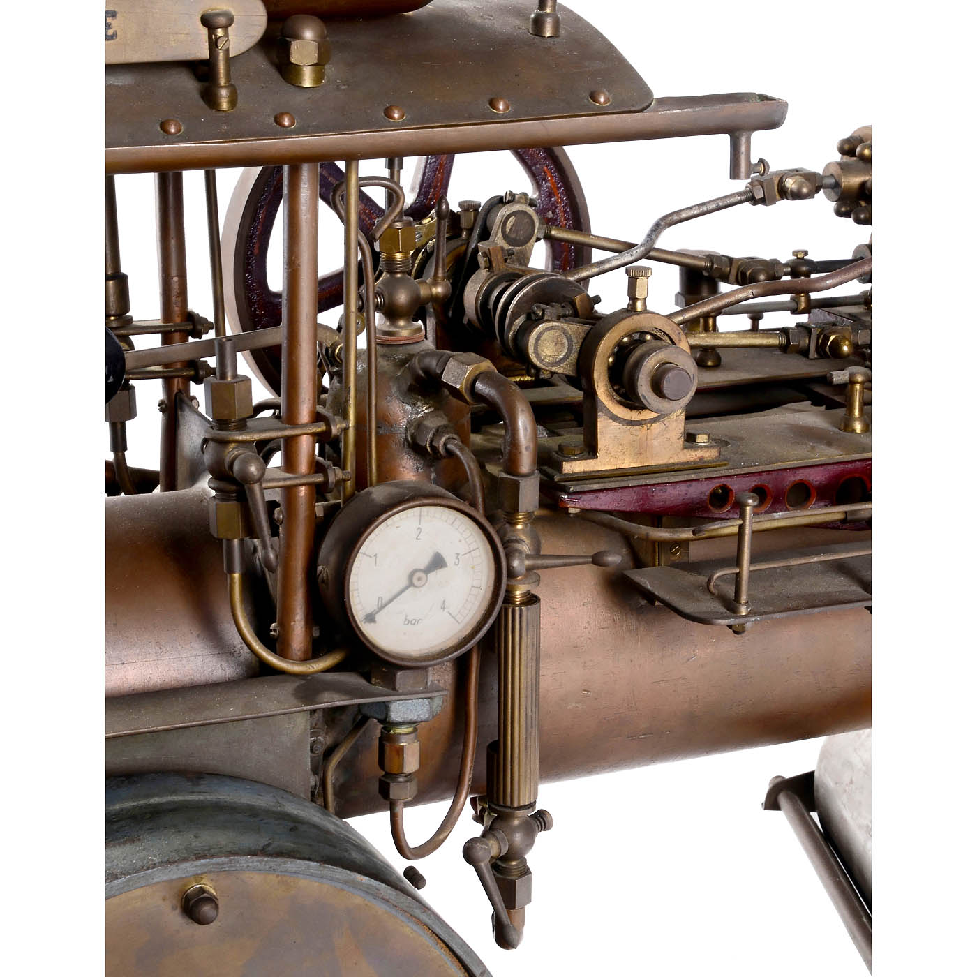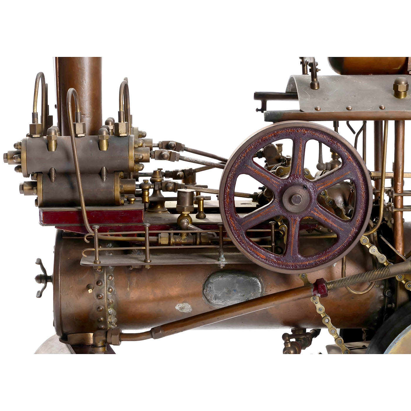 Brass, steel and cast iron, coal-fired boiler, two double-acting cylinders of 1 ½ in. diameter, chain-drive to the rear axle, flywheel 5 ¾ in. diameter, front axle steerable from the cab, parking brake, water tank on the roof, pressure gauge, weighted relief valve, overall length 27 ½ in. – A very well constructed and impressive model.