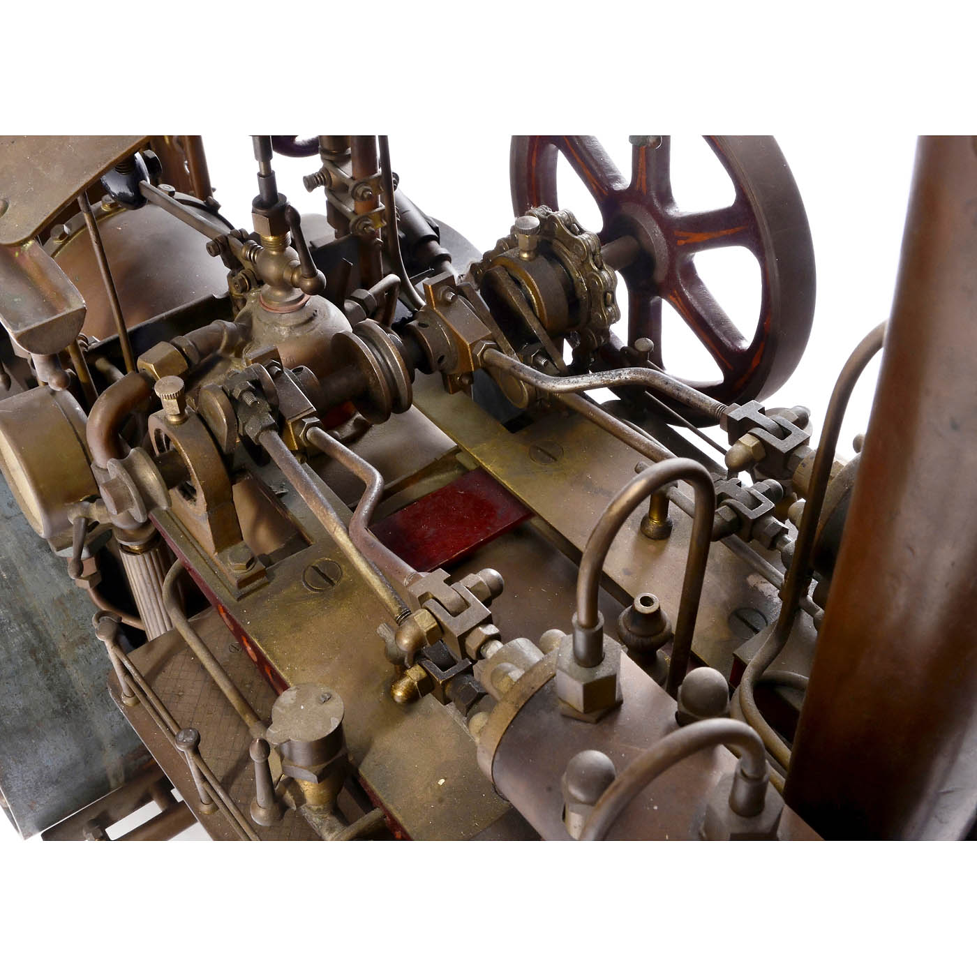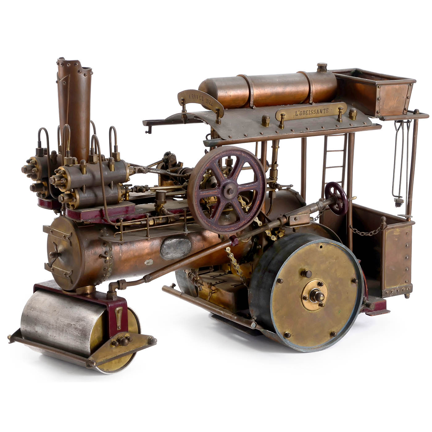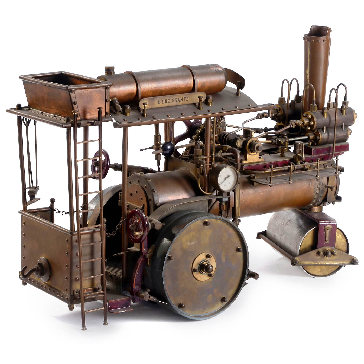 Brass, steel and cast iron, coal-fired boiler, two double-acting cylinders of 1 ½ in. diameter, chain-drive to the rear axle, flywheel 5 ¾ in. diameter, front axle steerable from the cab, parking brake, water tank on the roof, pressure gauge, weighted relief valve, overall length 27 ½ in. – A very well constructed and impressive model.
