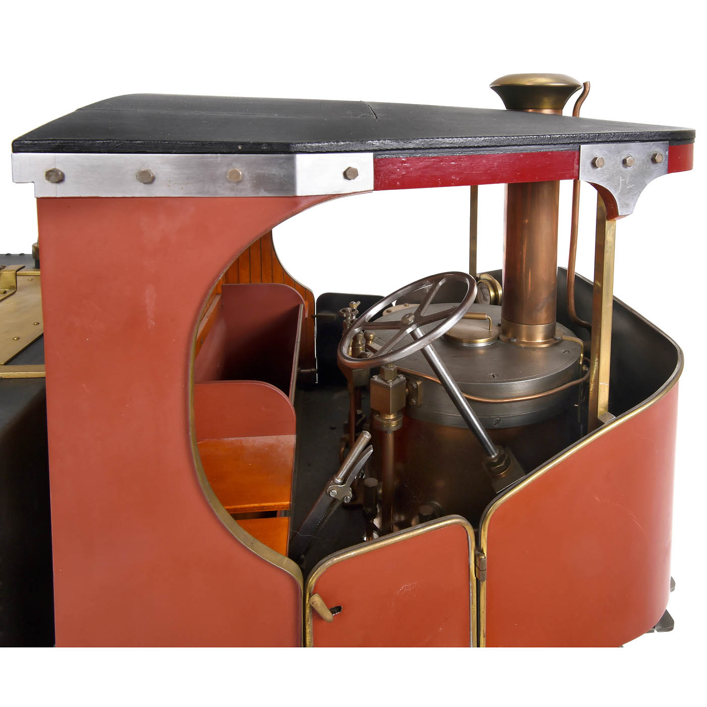 Cab with vertical coal-fired steel boiler with water glass, pressure gauge, safety valves, steam whistle and chimney, large twin-cylinder engine with chain-drive to rear wheels, hand-operated gear lever, steering wheel and hinged doors, the rear with mounted water tank, chassis with leaf springs and 4 spoked wheels with solid rubber tyres, the front wheels steered via Ackerman linkage, trailer with seat cushion, suitable for driving the truck, tractor unit 32 in., trailer 33 in.