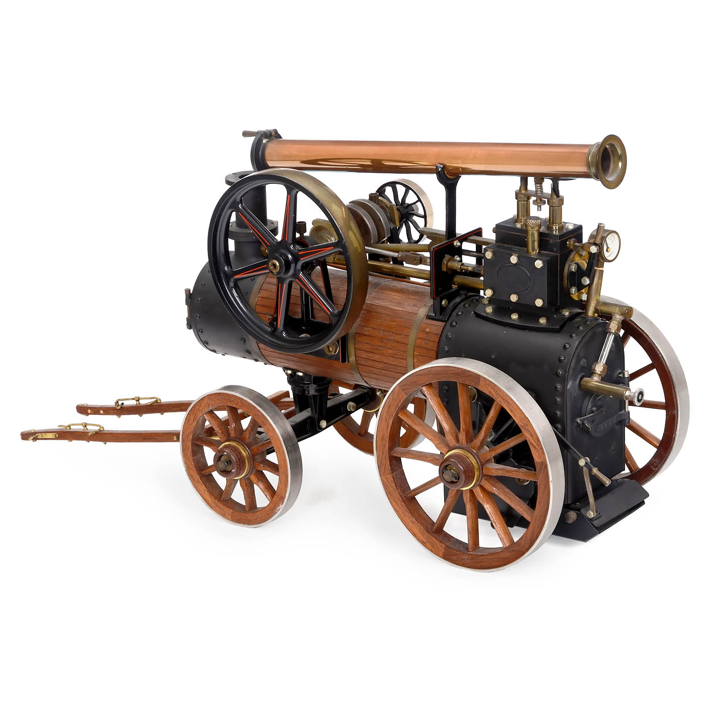 Maxwell Hemmens, Engineers, Thorganby, York. English working model of a single-cylinder engine, cast iron, steel, brass and wood, coal-fired, riveted and screwed steel flame-tube boiler, slide-valve control, pressure indicator, folding chimney, spoked wood wheels with iron tyres, front Ø 3 1/2 in., rear Ø 5 in., flywheel Ø 4 1/2 in., overall size including drawbar 20 x 6 x 18 ½ in. A detailed live-steam model with all its fixtures and fittings, in near-mint unfired condition.