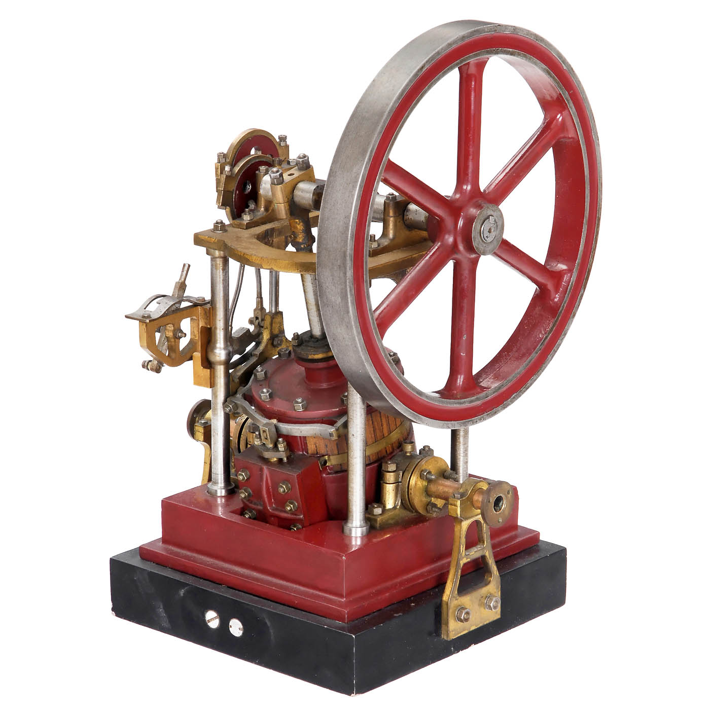 Polished-steel, cast-iron and brass construction, cylinder with vertical piston rod, reversible, with eccentric and counter eccentric cylinder Ø 2 3/4 in., spoked flywheel Ø 7 in., on cast-iron base and wood plinth, overall dimensions 7 4/5 x 7 x 11 2/5 in. – A rare construction, well-built and in working condition.