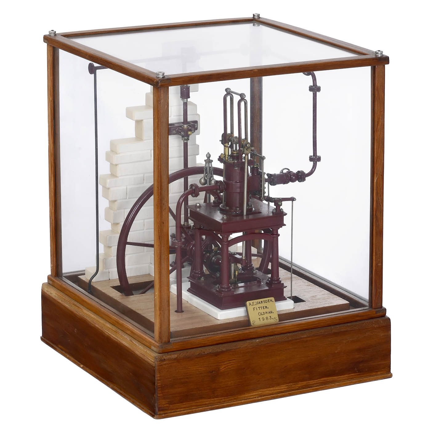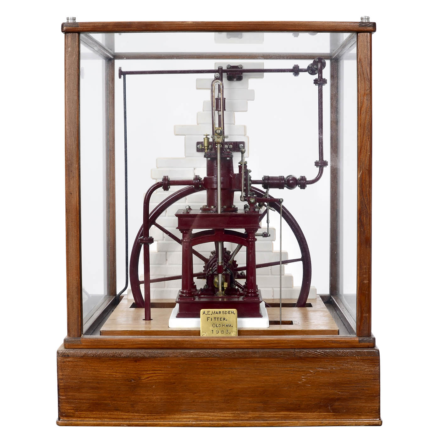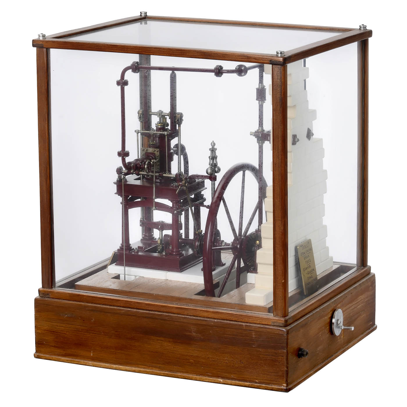 Extremely detailed 1-inch scale engineering model of the single-cylinder table engine from 1843 by R. Napier, Glasgow, brass, steel and maroon-enamelled cast-iron parts, four Doric columns, cylinder with vertical piston rod, power transmission with two rods to the crankshaft, eccentric rod slide valve control, working governor, feed pump, flywheel Ø 7 1/2 in., in 5-side glazed showcase, overall dimensions 13 x 12 ½ x 15 2/5 in., tested with pressure air, working, reverse with additional hand crank. – Built in 1983 by A.E. Marsden, Flitter, Oldham.