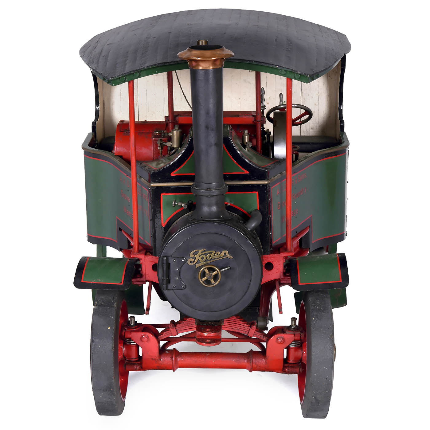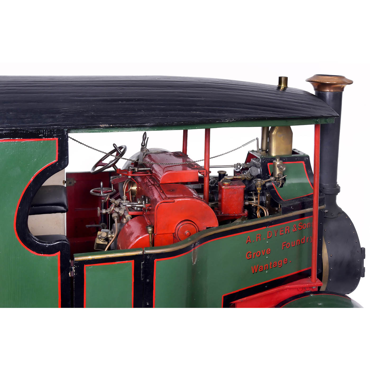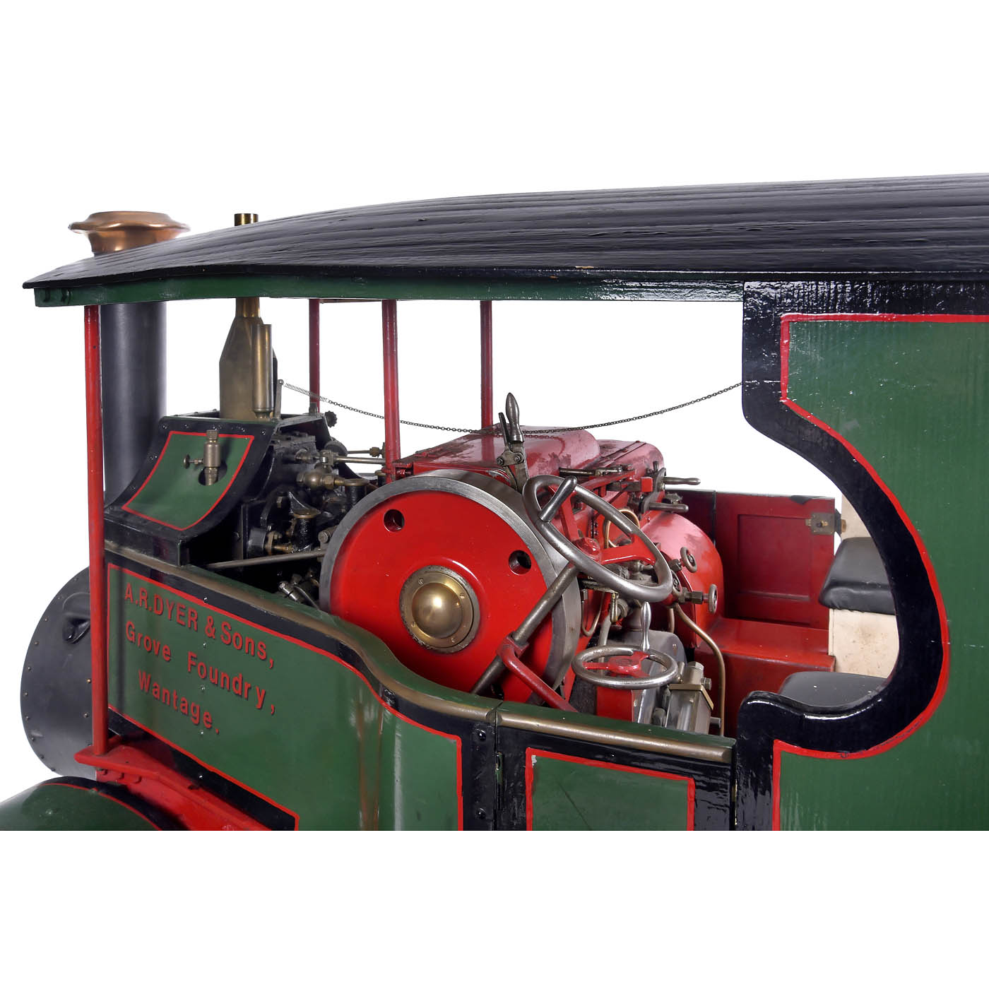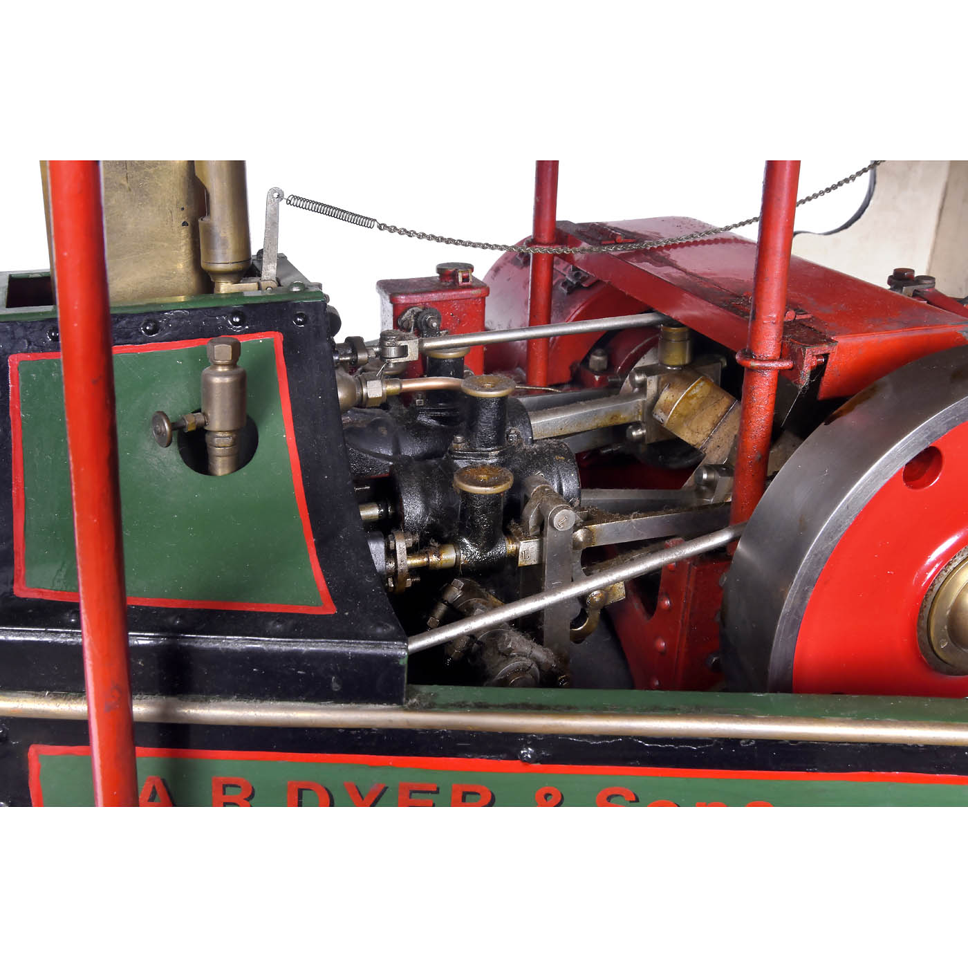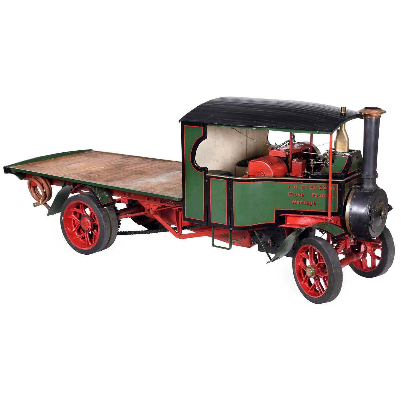 Working model of a Foden steam wagon with cast-iron flame-tube boiler and fittings including water gauge, shut-off cocks, pressure gauge, safety, blower, injector, steam whistle, blow down valves; engine detail including twin cylinders with Stephenson's link reverse, mechanical lubricator, counter-balanced crankshaft, three road speeds, flywheel and chain final drive; chassis details including channel section frame, Ackerman steering, rubber-tyred wheels, water tank, injector, wood cab with opening doors, trailer with wood-planked bed, leaf spring suspension and fitted mud guards; finished in green paintwork with legend: "A.R. Dyer & Sons, Grove Foundry, Wantage", 68 ½ x 23 x 27 ½ in. – Complete, good condition, untested.