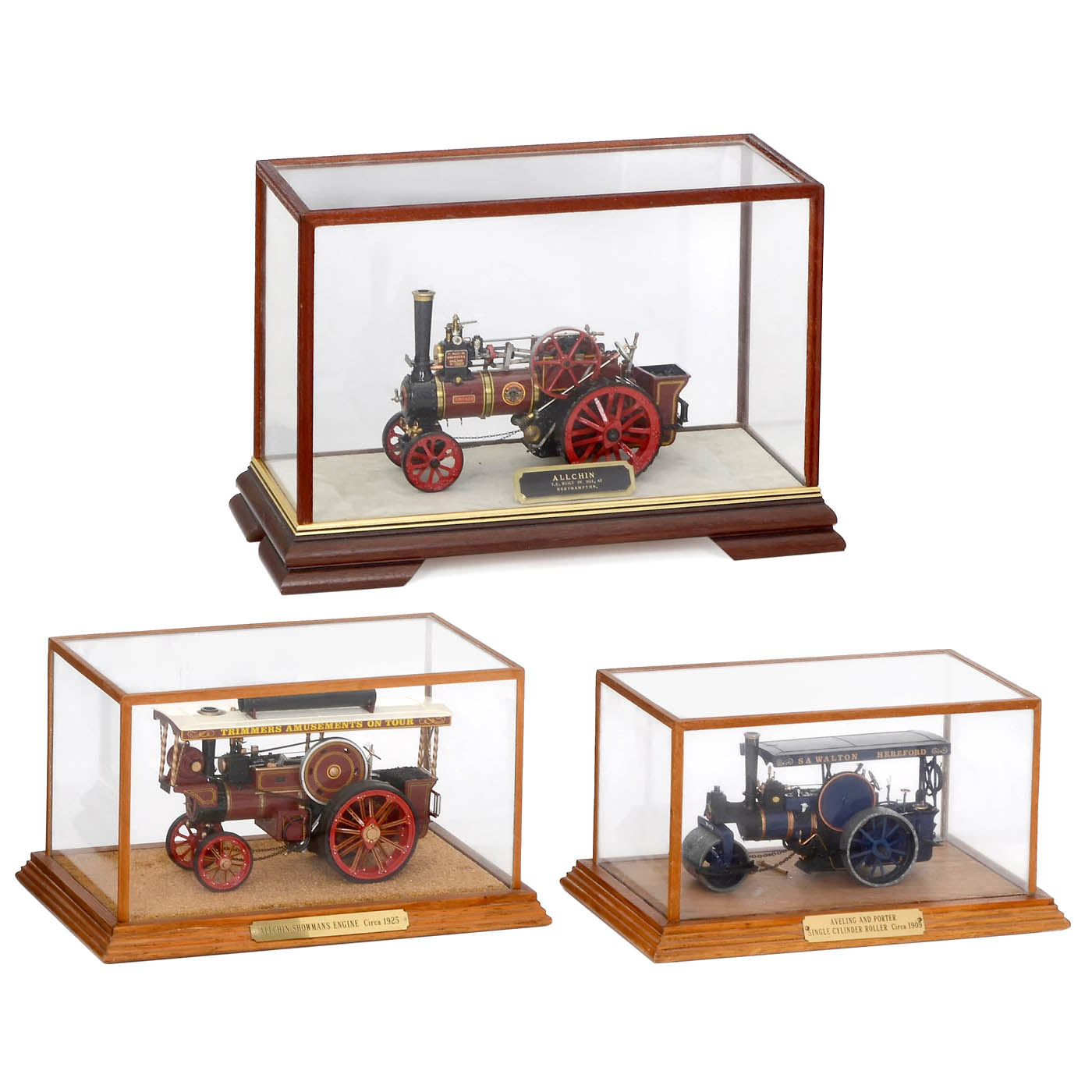 Scale 1:32, painted white metal, length 7 in., in display case. 1) Aveling & Porter, single-cylinder steamroller, 1909. – 2) Alchin showman’s traction engine, 1925. – And: 3) Alchin "Smokey" steam tractor, 1922.