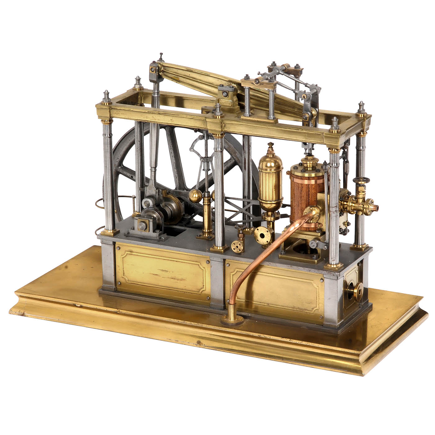 With maker's plaque "Kølsen Maskiner, Danmark, No. 051", brass, steel and cast iron, 6 brass pillars supporting an overhead walking beam with parallel motion, wood-lagged single-cylinder, Ø 1 in., spoked 5 1/2 in. flywheel, governor not working, on brass base, overall size 11 2/5 x 5 x 7 4/5 in., working somewhat stiff.