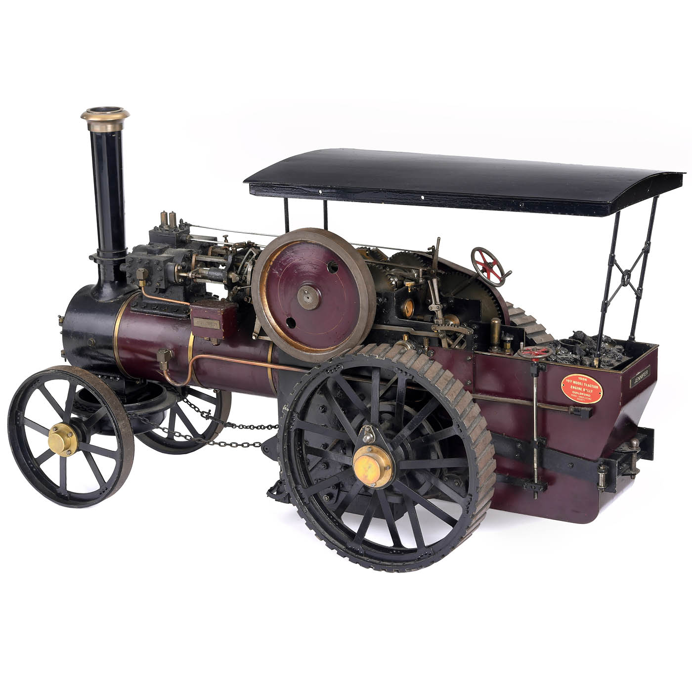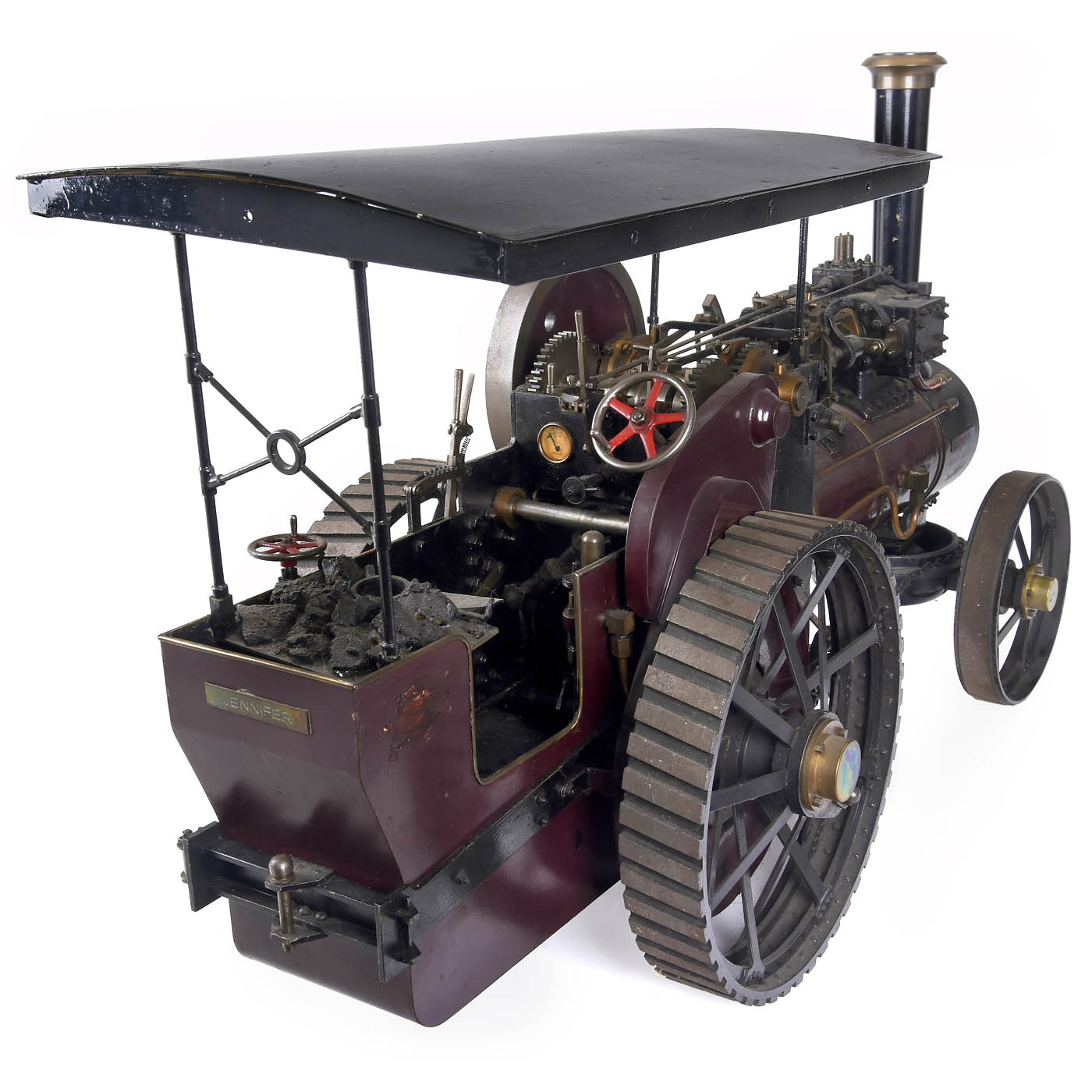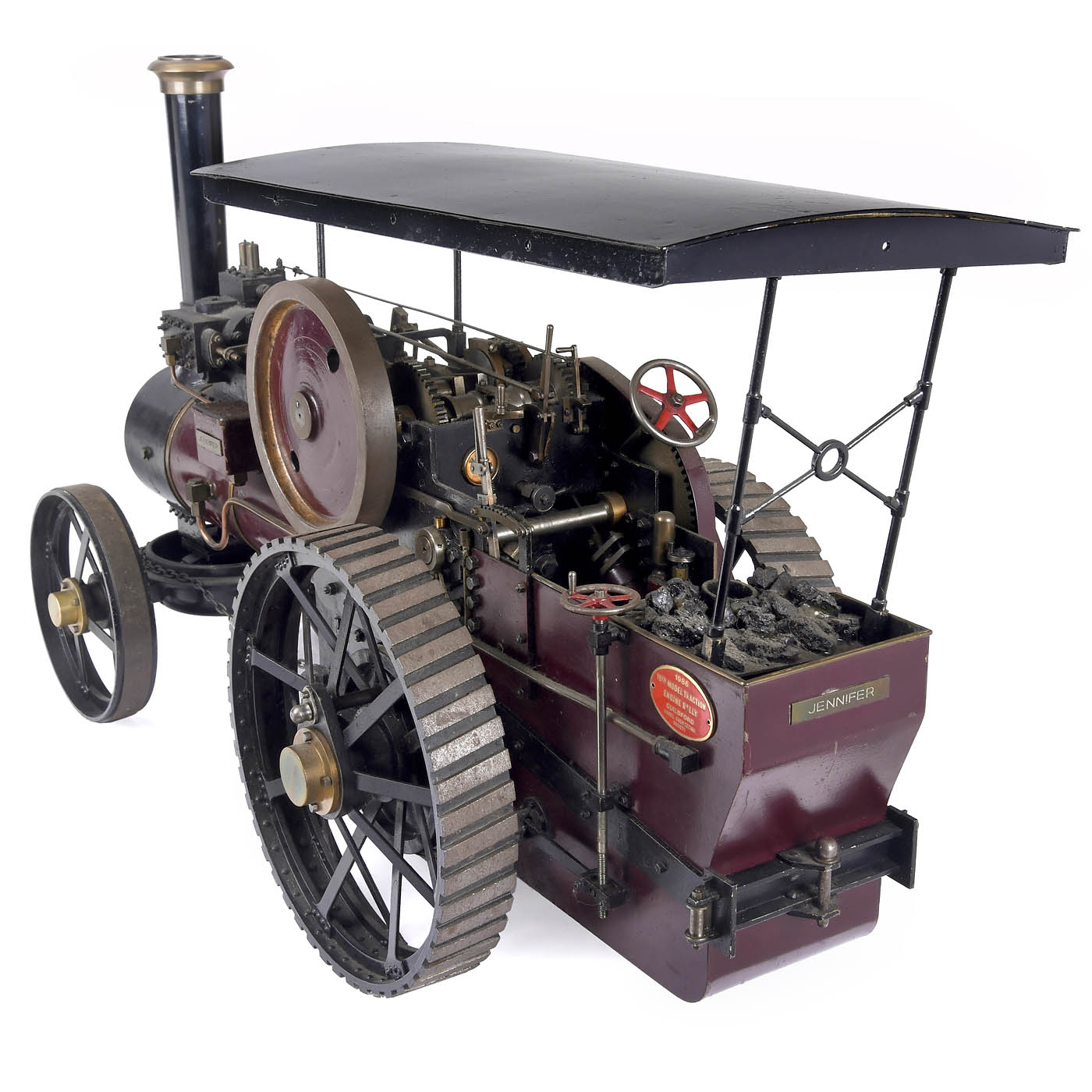 Large working model of the British "Jennifer" traction engine, coal-fired, twin-cylinder engine, Stephenson’s slide-valve gear, two-speed gearbox, flame-tube boiler, fusee and chain steering, reversible traction, brake, rope winch, pressure indicator, water gauge level, feed pump, driver's seat, detachable roof, spoked wheels, front Ø 5 ¾ in., rear Ø 8 ¼ in., flywheel Ø 5 in., overall 25 ½ x 9 ¼ x 14 7/8 in. – A detailed live-steam model with all its fixtures and fittings. – Note: Exhibited at the 19th Model Traction Engine Rally in Guildford, 1986.