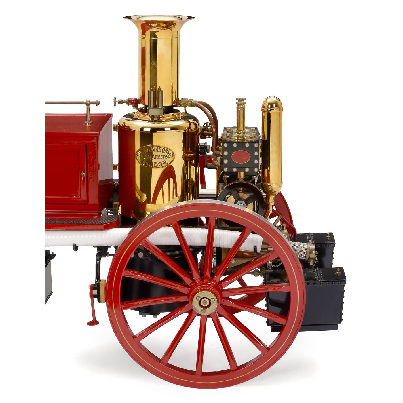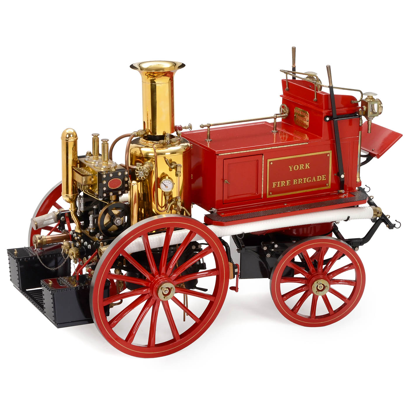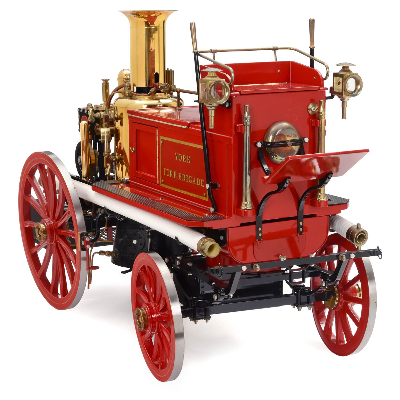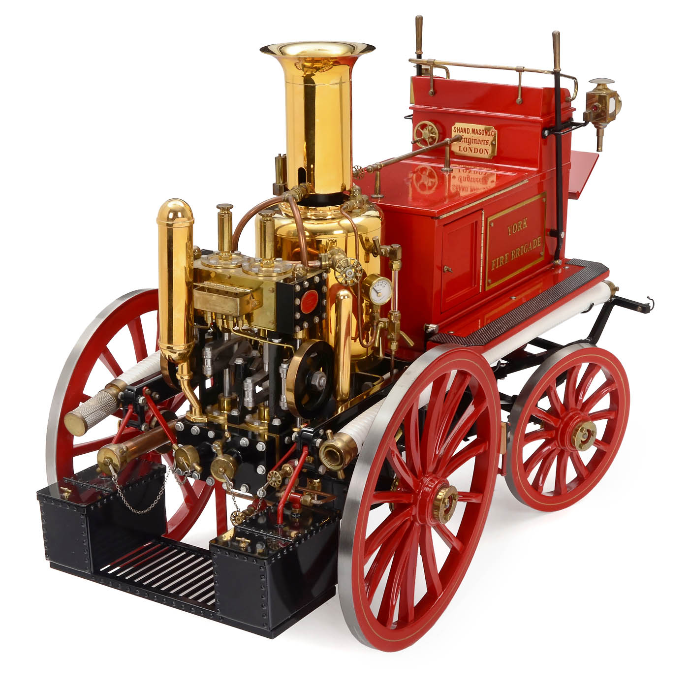 Maxwell Hemmens Precision Steam Models, England. "York Fire Brigade", finely detailed model, copper boiler with silver solder, all fittings, hoses and nozzles, 2-cylinder engine with cylinder head oiler, eccentric feed pump and stopcock, 2 spoked flywheels, directly coupled water pumps, water tanks, suction and delivery hose, red-and-black-painted chassis and superstructure, wood spoked wheels with metal rims, coal bunker, driver's seat with brass rail at the rear, braking device, bell, 2 lamps and "York Fire Brigade" sign, brass plate with the inscription "Shand Mason & Co, Engineers, London", length 21 ¼ in., width 9 ½ in. – This extremely accurate steam model was made in small series by Maxwell Hemmens, one of the most famous English model engineers. This model has never been fired.