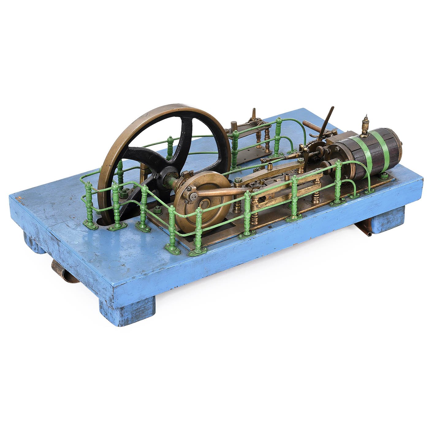 1) Built with prefabricated factory parts, c. 1980, brass, cast metal and steel, partially finished in green and red, 1 1/2-inch lagged brass-bound mahogany double-action cylinder, flywheel Ø 7 in., working governor (missing belt), on cast-iron base and wood plinth, 17 ¾ x 10 in. – And: 2) Bench-built, c. 1950, brass and cast iron, 2 1/3-inch cylinder, with reversible direction of rotation, sliding control with eccentric ring and reverse eccentric, crosshead guide, flywheel Ø 6 4/5 in., on wood base, 17 ¾ x 9 ½ in.
