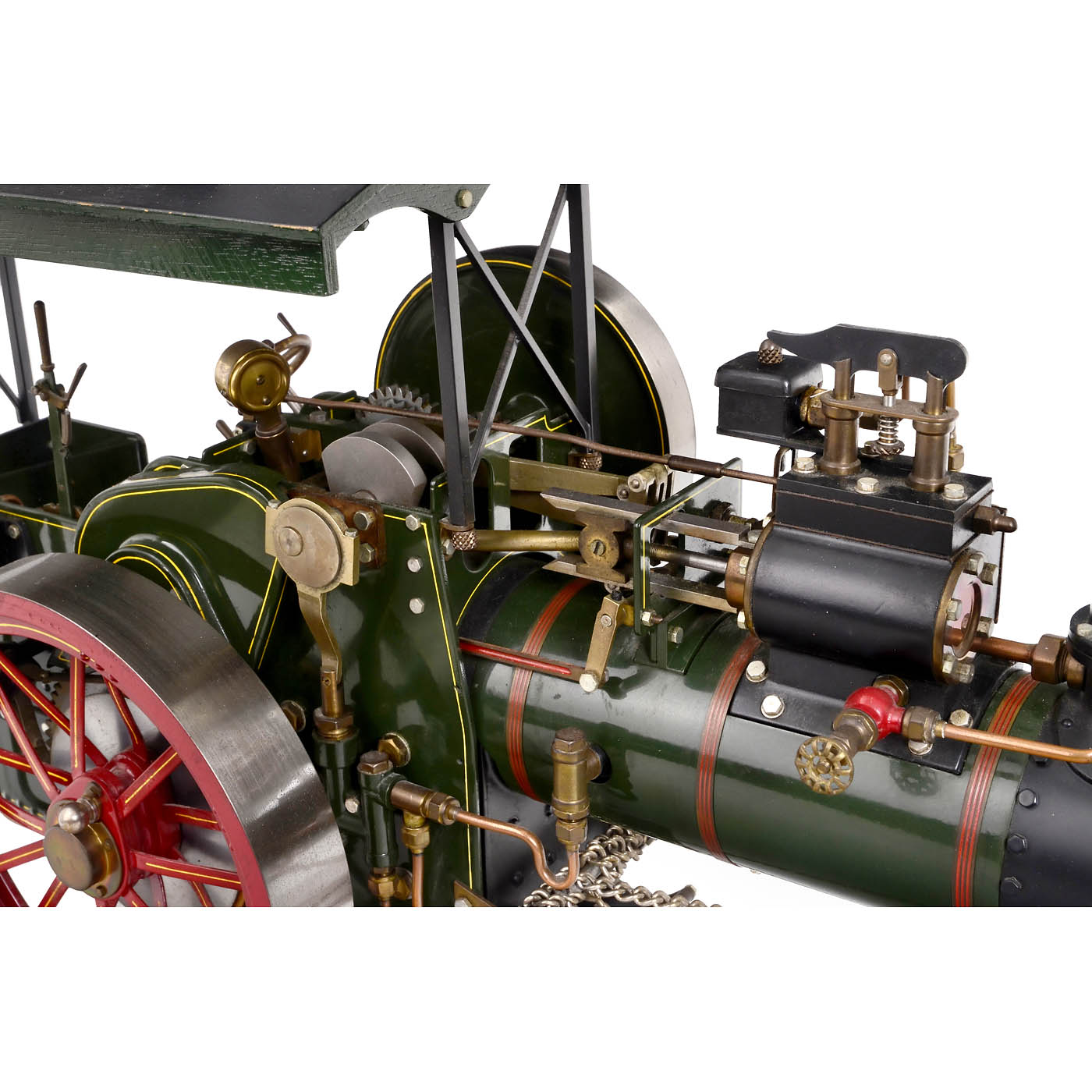 Maxwell Hemmens, Engineers, Thorganby, York. Reversible, 2 gears, steerable front axle with chains, parking brake, manometer, feed pump, rope winch, diver's stand with canopy, extendable chimney, fixed cylinder Ø 1 1/4 in., boiler Ø 2 3/4 in., flywheel Ø 4 1/2 in., overall size: 21 7/8 x 7 7/8 x 13 in., complete with all fittings, in near-mint unfired condition. A fascinating model of first-class engineering quality.
