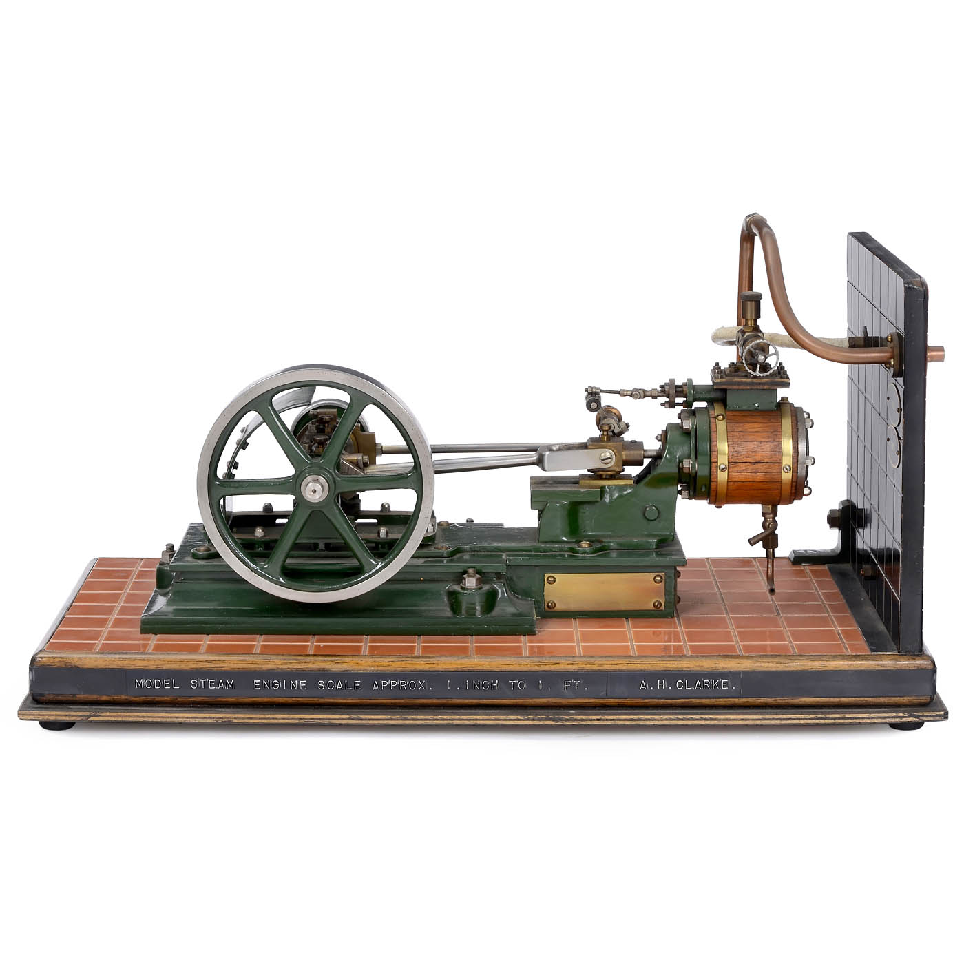 England, polished-steel, cast-iron and brass construction, partially green-lacquered, brass-bound mahogany-lagged cylinder Ø 2 1/5 in., slide valve control with excentric ring, spoked flywheel Ø 4 1/2 in., on cast-iron base and wood plinth with tiles, overall dimensions 17 x 8 ¾ x 9 1/2 in., working condition. – Built by A.H. Clarke, Birmingham in 1960, with 2 plaques from the Midland Model Engineering & Hobbies Exhibition, 1982 and 1983.