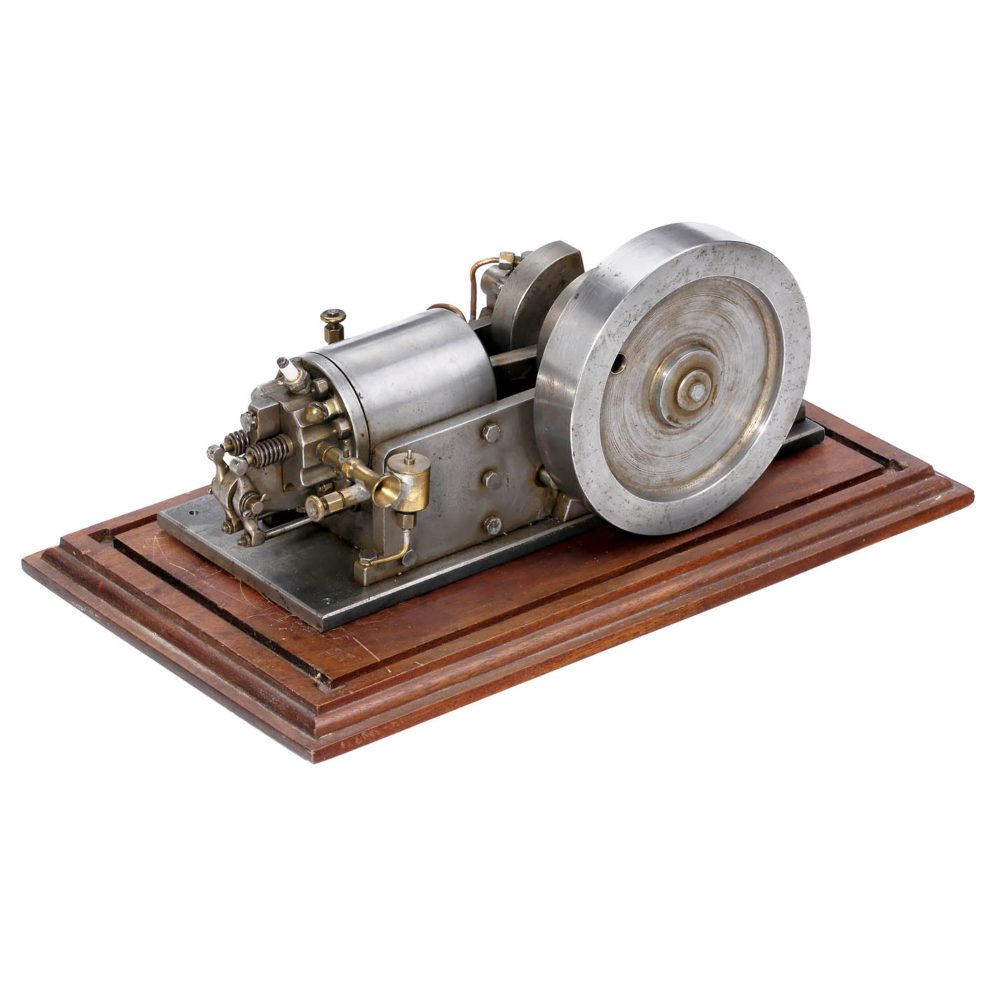 Probably England, steel, cast iron and brass, crosshead-guided piston rod to the crankshaft with 4 1/3-inch flywheel, glow plug KLG Mini 1, oil pump, on wood board, 11 ¾ x 7 in.