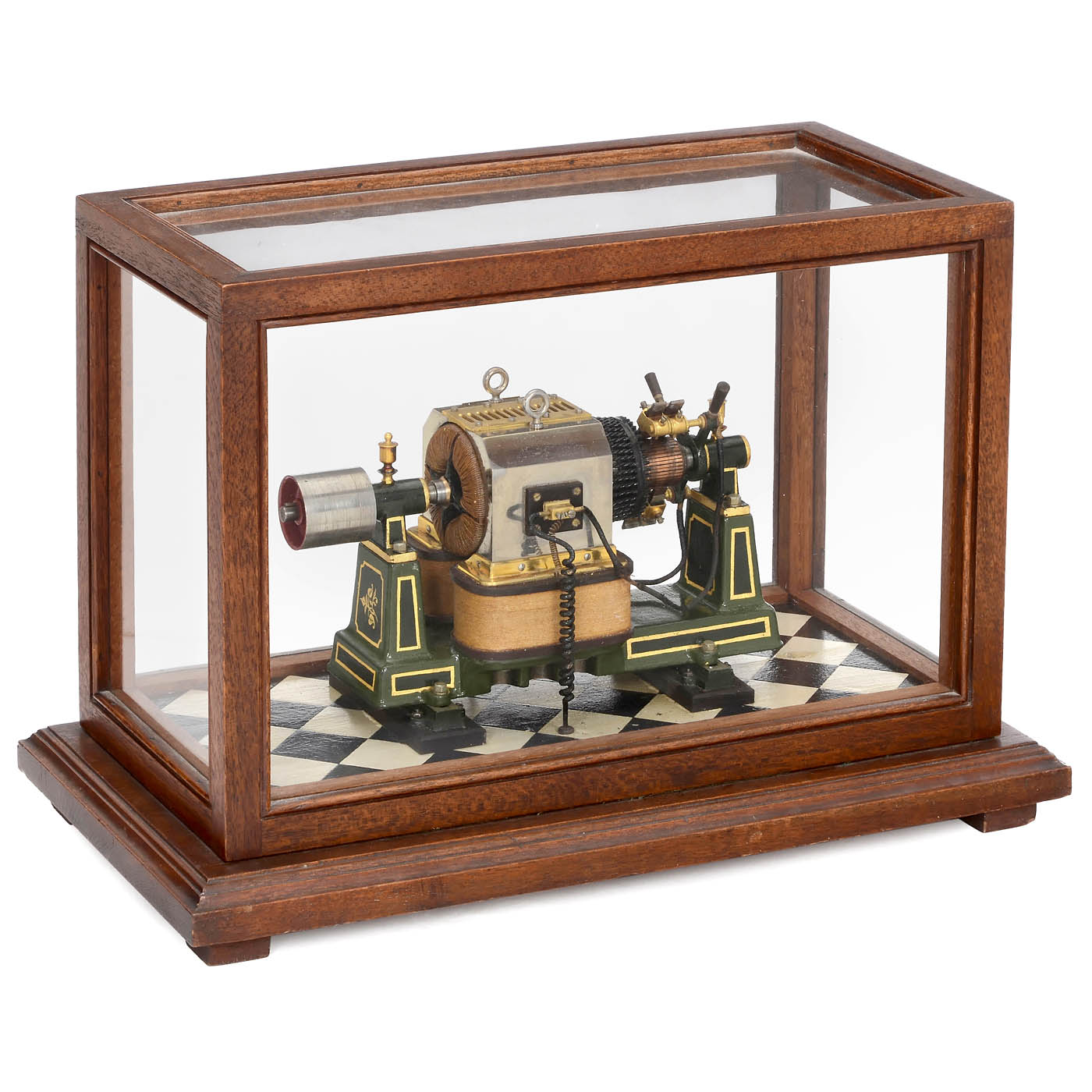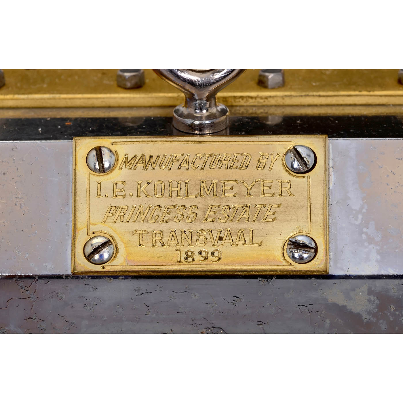 With brass plaque "Manufactured by I.E. Kohlmeyer, Princess Estate Transvaal, 1899", working model, 6 volts, very fine wiring, brass, steel and cast metal, green lacquer with gilt decoration, width 10 in., on walnut base under 5-sided glass cover.