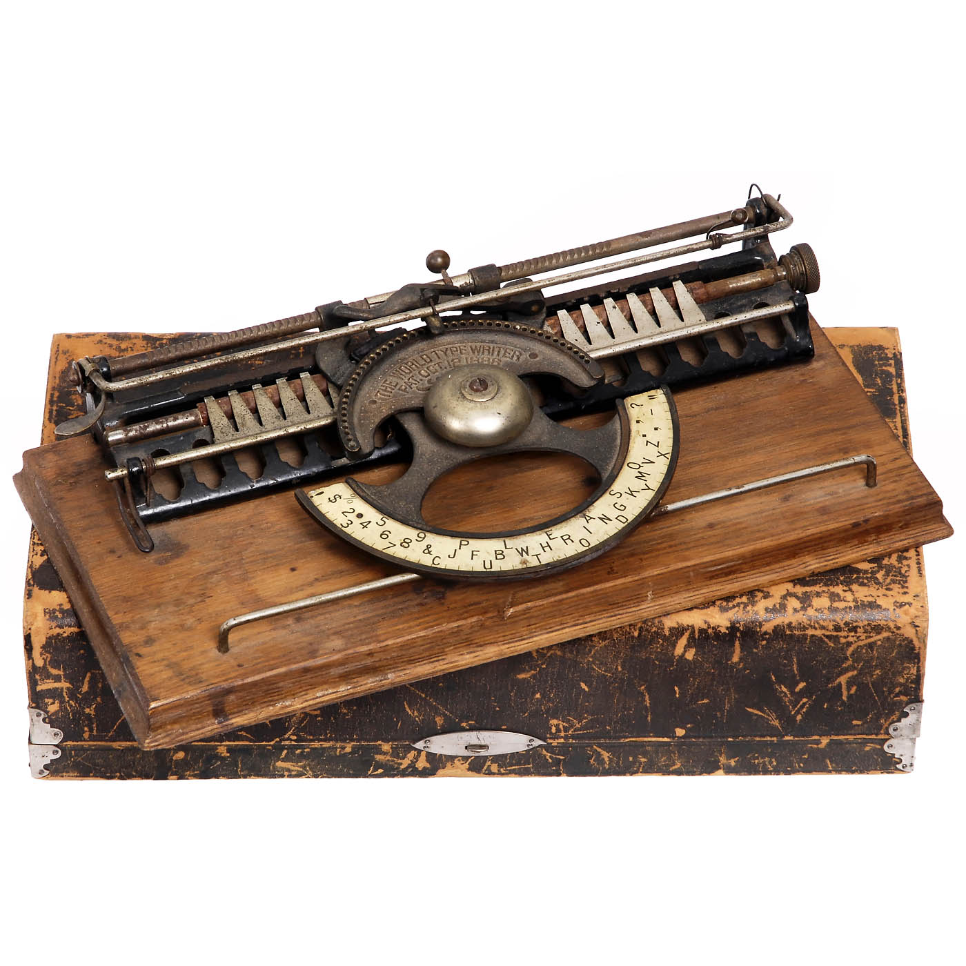 World Typewriter Co., Maine. Early American index typewriter with a semi-circular type plate, patented by John Becker in 1886, only upper-case typing, without rubber type sheet and swinging pointer, with original wood case. - Literature: Martin, 1949, p. 93.