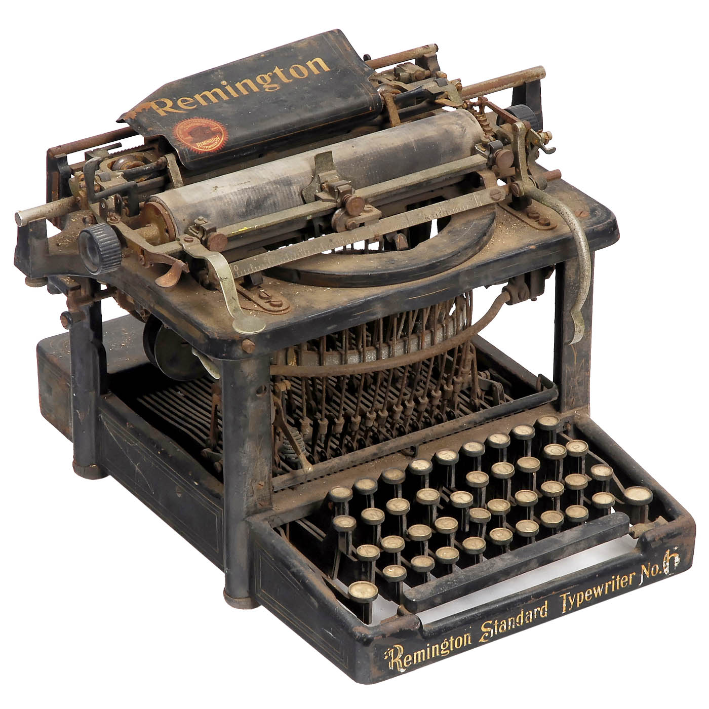 1) "Remington Standard No. 7", c. 1900, serial no. 82225, upstroke machine, in need of cleaning, carriage movement defective, missing paper table. (3/4) - 2) "Underwood Standard No. 1", c. 1899, no. 8176, 4-row frontstroke machine, 76 characters, mechanism somewhat stiff. (3/3) - 3) "Remington Standard No. 6", c. 1899, no. 165789, upstroke, 38 keys, mechanism sticks, in need of cleaning, partly rusty. (5/5) - And: 4) "L.C. Smith No. 8/10", c. 1918, with tabulator, working, in need of cleaning. (3-4/3-4)